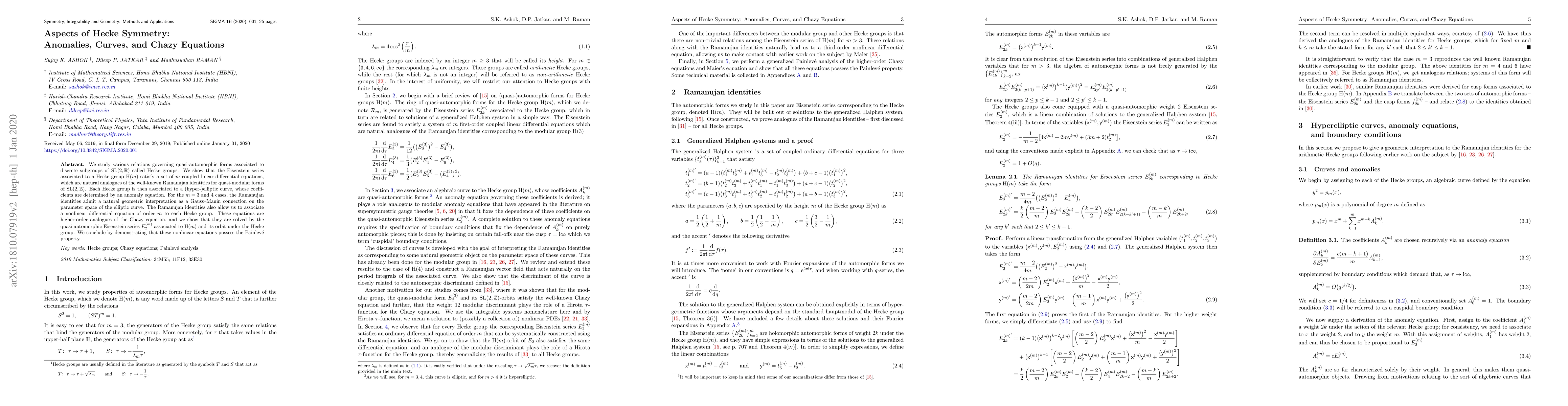 This research explores Hecke symmetry aspects, linking quasi-automorphic forms to discrete SL(2,ℝ) subgroups. It shows Eisenstein series satisfy m coupled differential equations, akin to Ramanujan identities. These equations relate to (hyper-)elliptic curves, Gauss-Manin connections, and higher-order Chazy equations, solved by quasi-automorphic Eisenstein series. The nonlinear equations exhibit the Painlevé property.