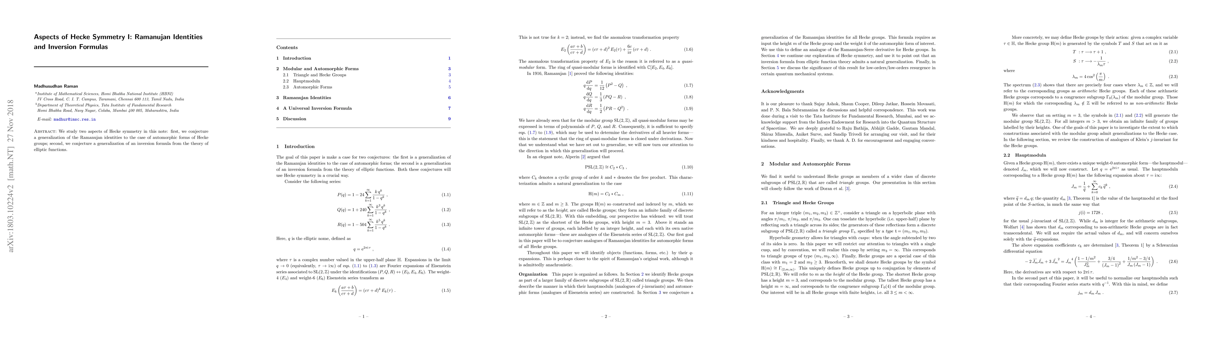 We study two aspects of Hecke symmetry in this note: first, we conjecture a generalization of the Ramanujan identities to the case of automorphic forms of Hecke groups; second, we conjecture a generalization of an inversion formula from the theory of elliptic functions.