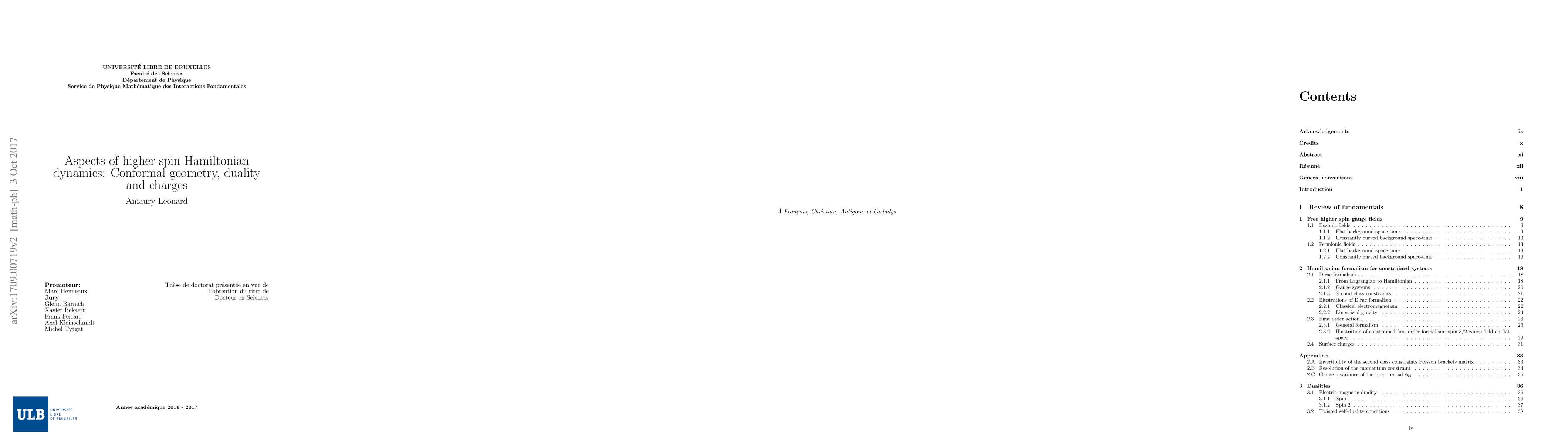 We have studied free higher spin gauge fields through an investigation of their Hamiltonian dynamics. Over a flat space-time, their Hamiltonian constraints were identified and solved through the introduction of prepotentials, enjoying both linearized generalized diffeomorphism and linearized generalized Weyl rescaling gauge invariance, motivating our study of conformal invariants for higher spins. We built these with the Cotton tensor, whose properties (tracelessness, symmetry, divergencelessness; completeness, invariance) we established. With these geometric tools, a first order action was written down in terms of the prepotentials. It is manifestly invariant under electric-magnetic duality which, with the gauge freedom of the prepotentials, completely fixes the action. This action is associated to twisted self-duality conditions. With an interest in supersymmetric extensions, we began to extend this study to fermions, similarly analyzing the spin $5/2$ massless free field, whose prepotential also enjoys conformal gauge invariance. The spin $2$-spin $5/2$ supermultiplet was considered, and a rigid symmetry of its action (a chirality-duality rotation) was built to commute with supersymmetry. We also investigated the properties of a mixed symmetry field on a flat six-dimensional space-time, the so-called chiral $(2,2)$-form: Hamiltonian analysis, prepotentials, and a first order action associated to self-duality conditions. Finally, we studied both fermionic and bosonic higher spin surface charges over a constantly curved background space-time. The Hamitonian constraints are the generators of gauge transformations. Plugging into them appropriate values of the gauge parameters (imposing a physical variation of the fields), their finite and non-vanishing on-shell values were computed and recognized as conserved charges of the theory. Their algebra was checked to be abelian.