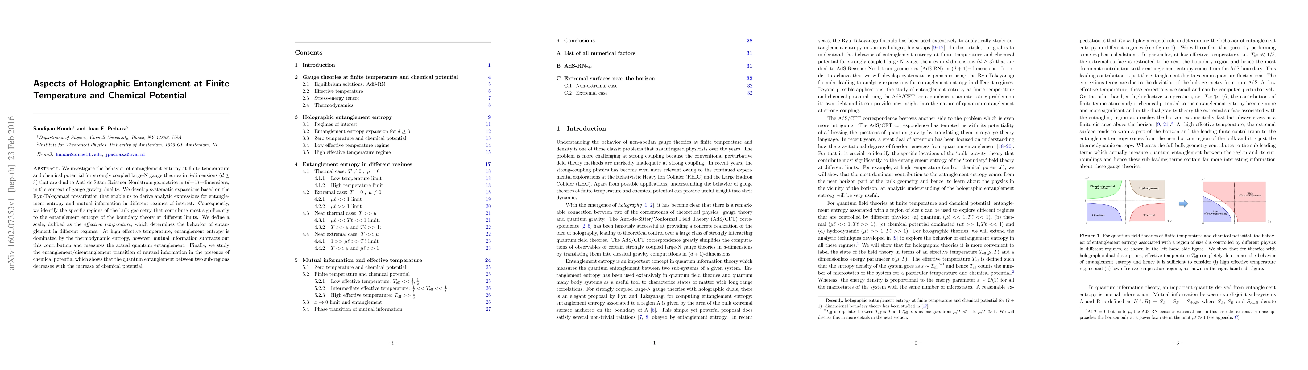 This paper explores the entanglement entropy in strongly coupled large-N gauge theories at finite temperature and chemical potential, using the gauge-gravity duality. It develops systematic expansions to derive analytic expressions for entanglement entropy and mutual information, identifying regions in the bulk geometry that contribute most significantly to boundary theory entanglement.