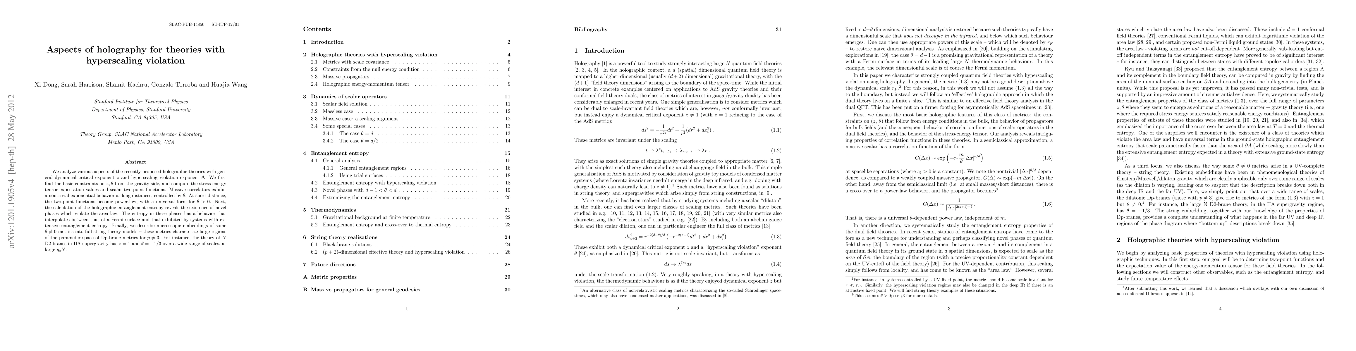 We analyze various aspects of the recently proposed holographic theories with general dynamical critical exponent z and hyperscaling violation exponent $\theta$. We first find the basic constraints on $z, \theta$ from the gravity side, and compute the stress-energy tensor expectation values and scalar two-point functions. Massive correlators exhibit a nontrivial exponential behavior at long distances, controlled by $\theta$. At short distance, the two-point functions become power-law, with a universal form for $\theta > 0$. Next, the calculation of the holographic entanglement entropy reveals the existence of novel phases which violate the area law. The entropy in these phases has a behavior that interpolates between that of a Fermi surface and that exhibited by systems with extensive entanglement entropy. Finally, we describe microscopic embeddings of some $\theta \neq 0$ metrics into full string theory models -- these metrics characterize large regions of the parameter space of Dp-brane metrics for $p\neq 3$. For instance, the theory of N D2-branes in IIA supergravity has z=1 and $\theta = -1/3$ over a wide range of scales, at large $g_s N$.