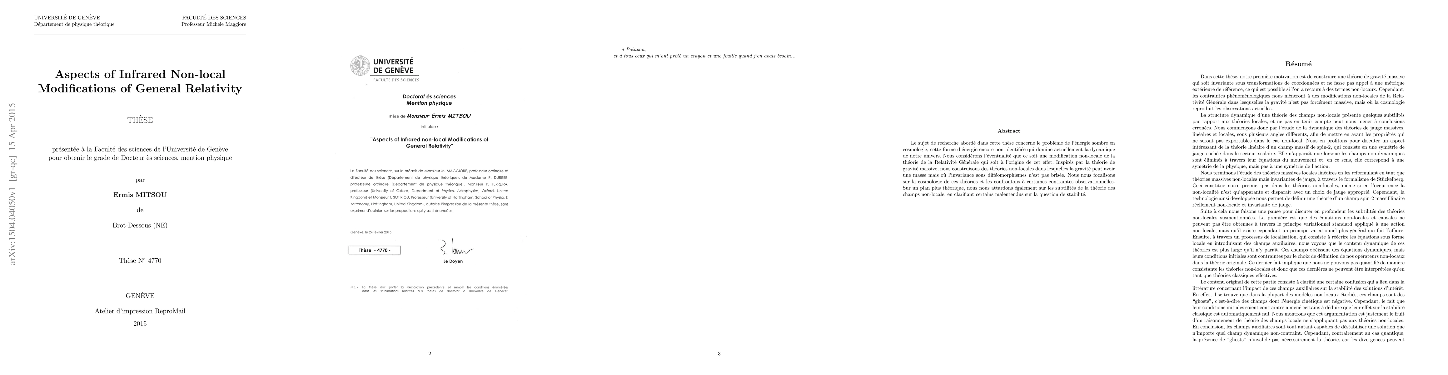 This research explores dark energy as a potential outcome of non-local modifications to General Relativity, inspired by massive gravity theories. It preserves diffeomorphism symmetry, examines cosmological implications, and addresses stability issues in non-local field theory, combining published and original work.