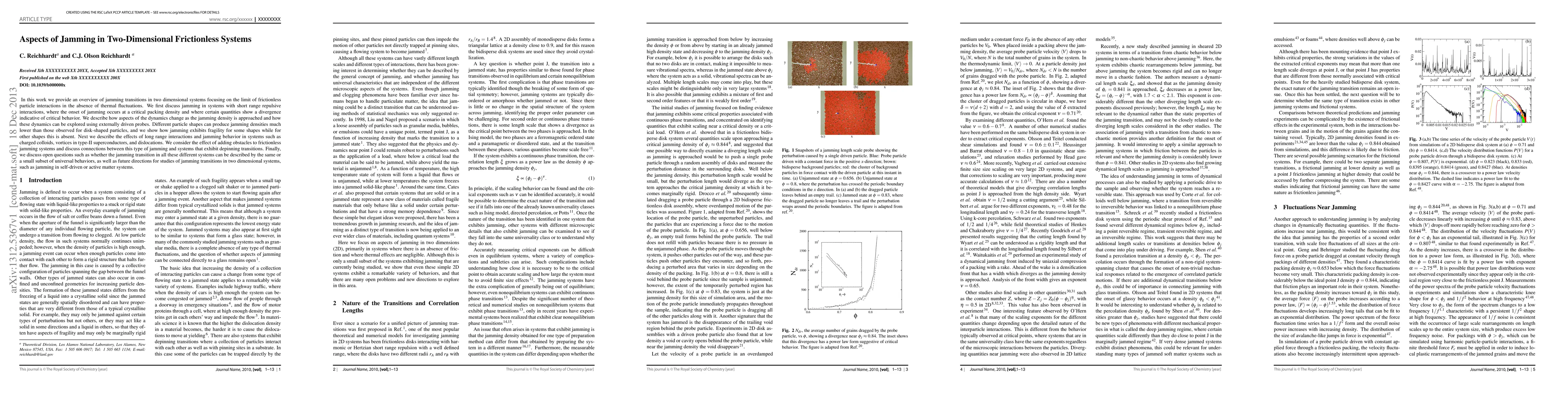 This paper reviews jamming transitions in two-dimensional frictionless systems, focusing on short-range repulsive interactions and the absence of thermal fluctuations. It explores how jamming density varies with particle shape and discusses the impact of long-range interactions, obstacles, and potential universal behaviors in different systems.