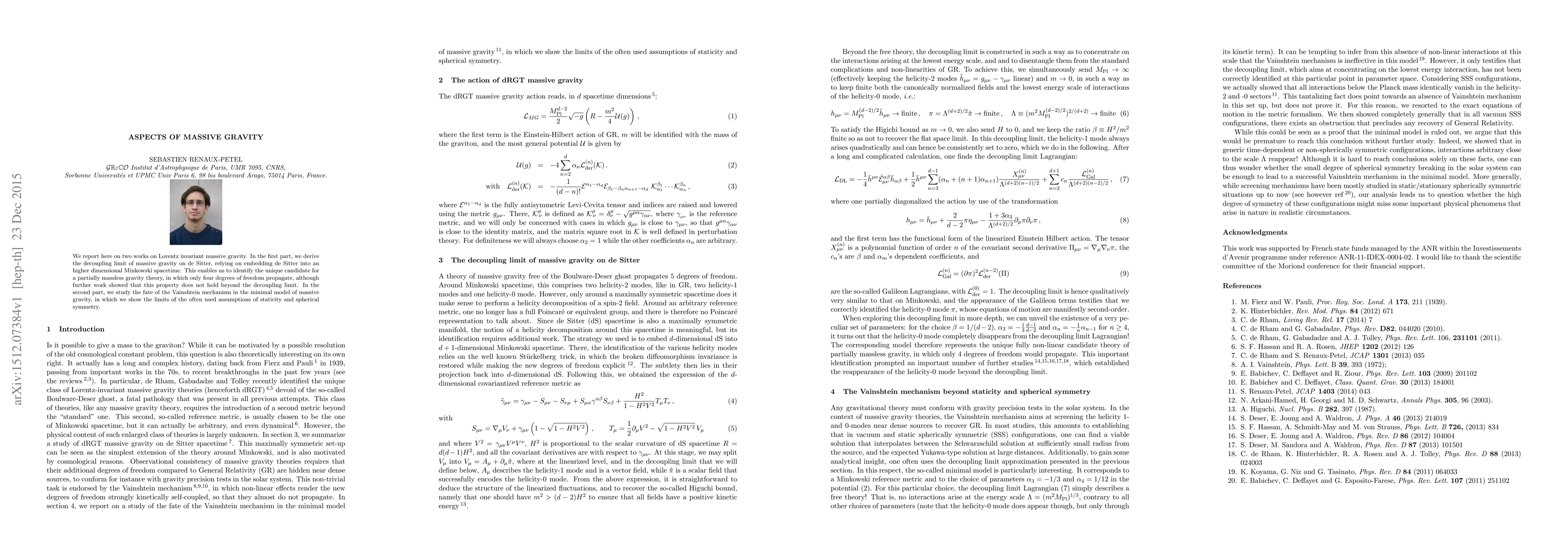 We report here on two works on Lorentz invariant massive gravity. In the first part, we derive the decoupling limit of massive gravity on de Sitter, relying on embedding de Sitter into an higher dimensional Minkowski spacetime. This enables us to identify the unique candidate for a partially massless gravity theory, in which only four degrees of freedom propagate, although further work showed that this property does not hold beyond the decoupling limit. In the second part, we study the fate of the Vainshtein mechanism in the minimal model of massive gravity, in which we show the limits of the often used assumptions of staticity and spherical symmetry.