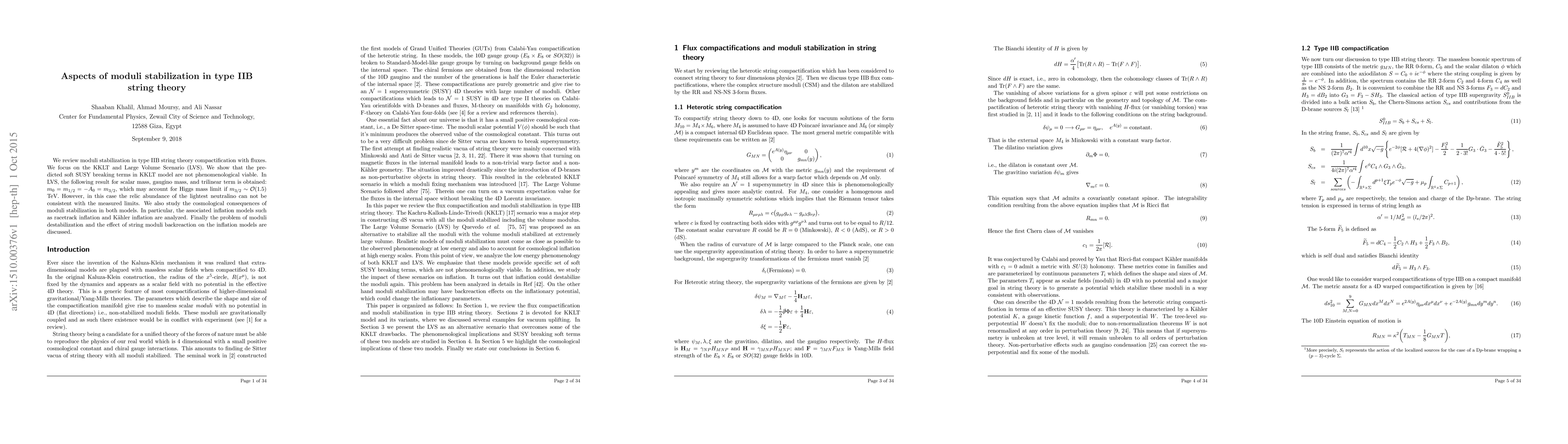 The paper reviews moduli stabilization in type IIB string theory compactification with fluxes, focusing on the KKLT and Large Volume Scenario (LVS).
