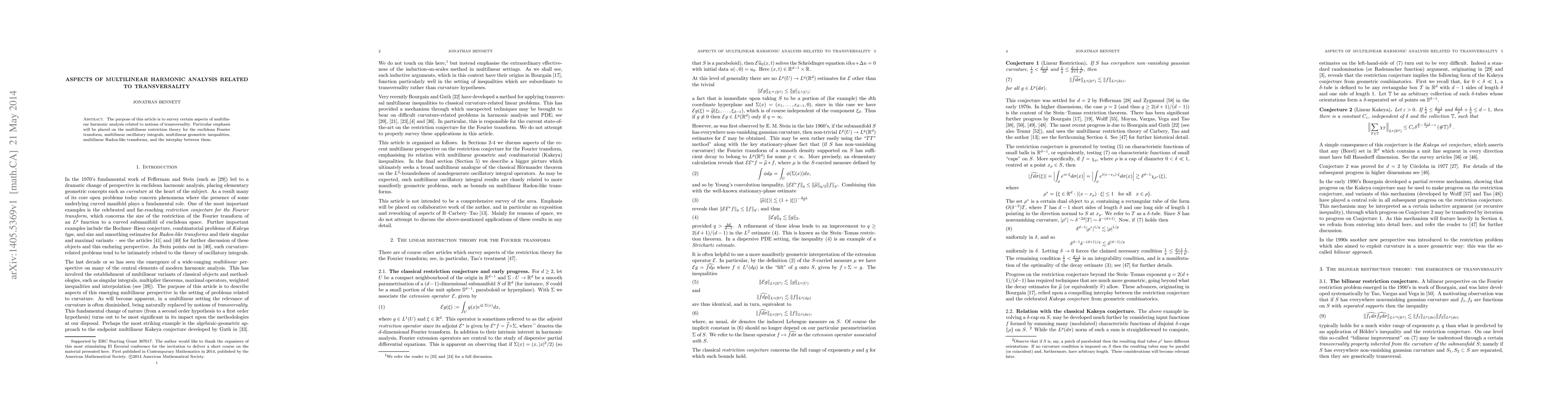This paper surveys multilinear harmonic analysis focusing on transversality, covering multilinear restriction theory, oscillatory integrals, geometric inequalities, and Radon-like transforms, highlighting their interconnections.