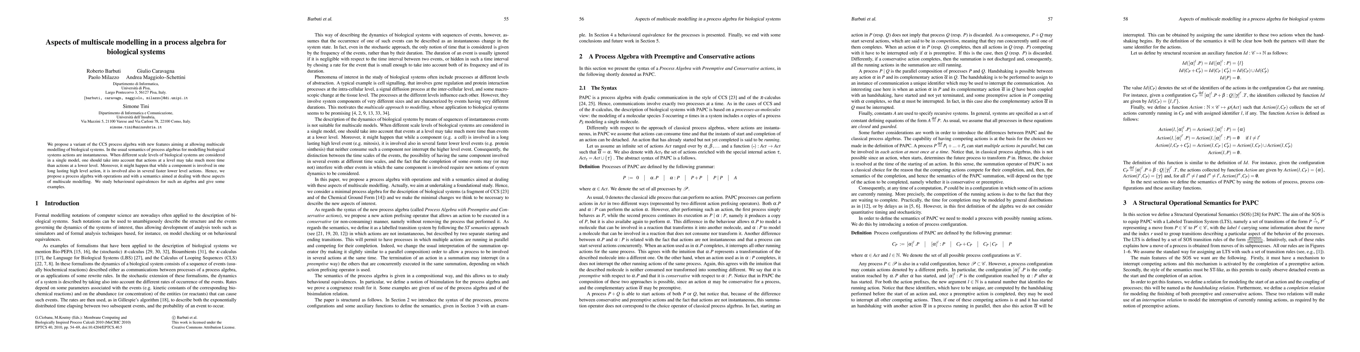 We propose a variant of the CCS process algebra with new features aiming at allowing multiscale modelling of biological systems. In the usual semantics of process algebras for modelling biological systems actions are instantaneous. When different scale levels of biological systems are considered in a single model, one should take into account that actions at a level may take much more time than actions at a lower level. Moreover, it might happen that while a component is involved in one long lasting high level action, it is involved also in several faster lower level actions. Hence, we propose a process algebra with operations and with a semantics aimed at dealing with these aspects of multiscale modelling. We study behavioural equivalences for such an algebra and give some examples.