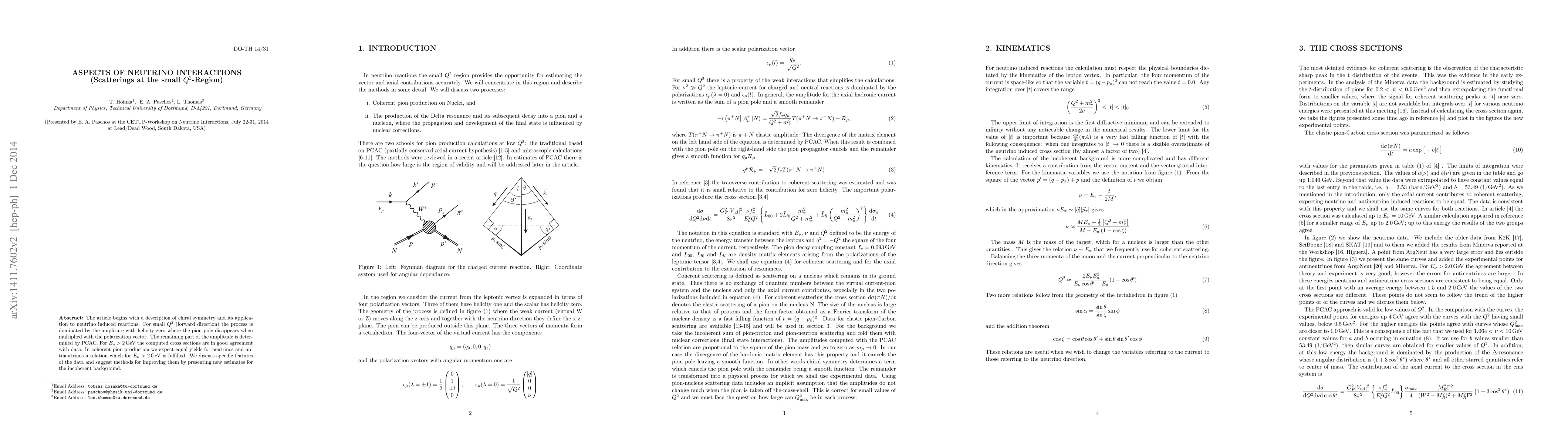 The article begins with a description of chiral symmetry and its application to neutrino induced reactions. For small $Q^2$ (forward direction) the process is dominated by the amplitute with helicity zero where the pion pole disappears when multiplied with the polarization vector. The remaining part of the amplitude is determined by PCAC. For $E_\nu > 2$ GeV the computed cross sections are in good agreement with data. In coherent pion production we expect equal yields for neutrinos and antineutrinos a relation which for $E_\nu > 2$ GeV is fulfilled. We discuss specific features of the data and suggest methods for improving them by presenting new estimates for the incoherent background.