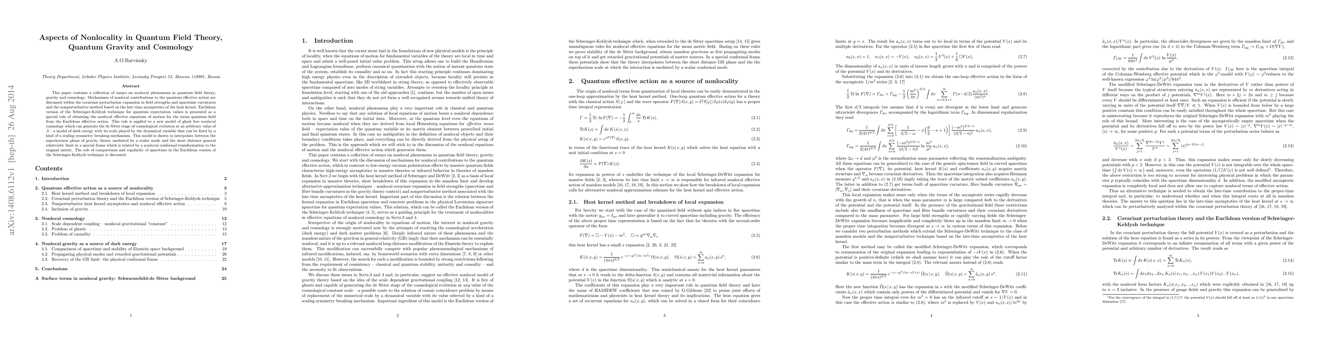 This paper contains a collection of essays on nonlocal phenomena in quantum field theory, gravity and cosmology. Mechanisms of nonlocal contributions to the quantum effective action are discussed within the covariant perturbation expansion in field strengths and spacetime curvatures and the nonperturbative method based on the late time asymptotics of the heat kernel. Euclidean version of the Schwinger-Keldysh technique for quantum expectation values is presented as a special rule of obtaining the nonlocal effective equations of motion for the mean quantum field from the Euclidean effective action. This rule is applied to a new model of ghost free nonlocal cosmology which can generate the de Sitter stage of cosmological evolution at an arbitrary value of $\varLambda$ -- a model of dark energy with its scale played by the dynamical variable that can be fixed by a kind of a scaling symmetry breaking mechanism. This model is shown to interpolate between the superhorizon phase of gravity theory mediated by a scalar mode and the short distance general relativistic limit in a special frame which is related by a nonlocal conformal transformation to the original metric. The role of compactness and regularity of spacetime in the Euclidean version of the Schwinger-Keldysh technique is discussed.