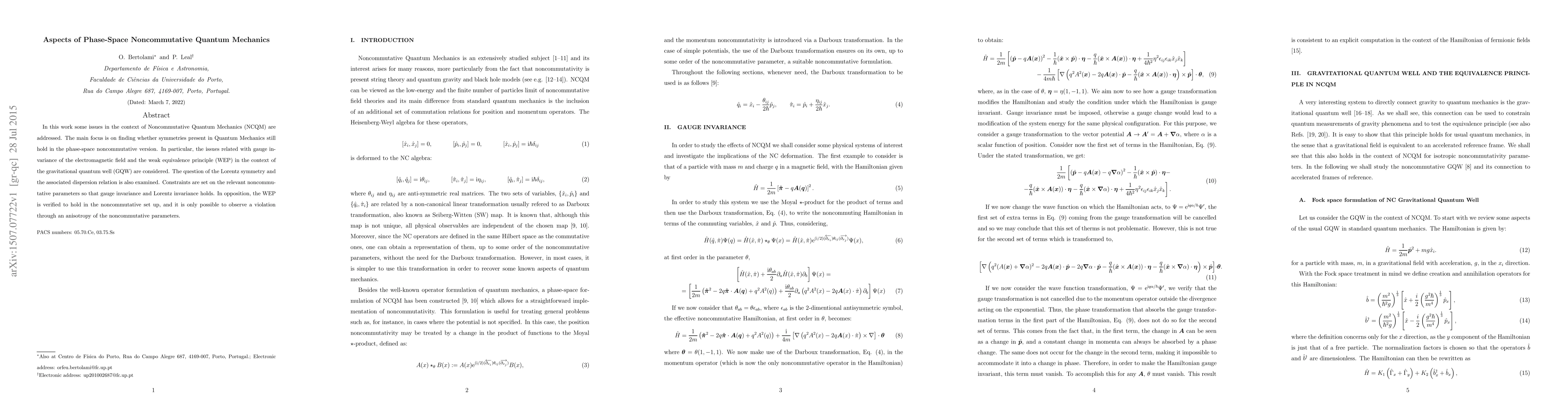 This research investigates the symmetries in phase-space noncommutative quantum mechanics, particularly focusing on gauge invariance, Lorentz symmetry, and the weak equivalence principle in gravitational quantum wells. It concludes that while gauge and Lorentz invariances can be preserved with certain constraints, the weak equivalence principle holds unless noncommutative parameters exhibit anisotropy.