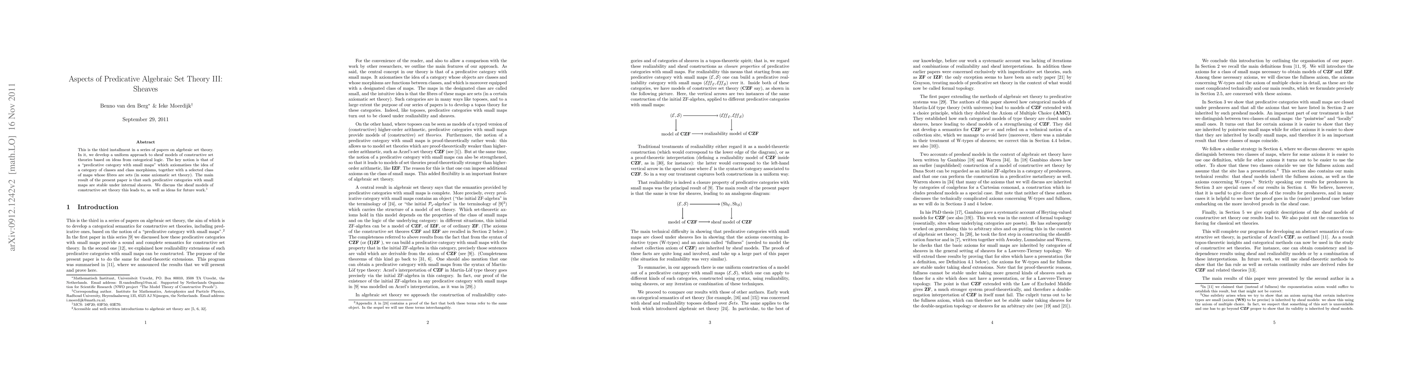 This is the third installment in a series of papers on algebraic set theory. In it, we develop a uniform approach to sheaf models of constructive set theories based on ideas from categorical logic. The key notion is that of a "predicative category with small maps" which axiomatises the idea of a category of classes and class morphisms, together with a selected class of maps whose fibres are sets (in some axiomatic set theory). The main result of the present paper is that such predicative categories with small maps are stable under internal sheaves. We discuss the sheaf models of constructive set theory this leads to, as well as ideas for future work.