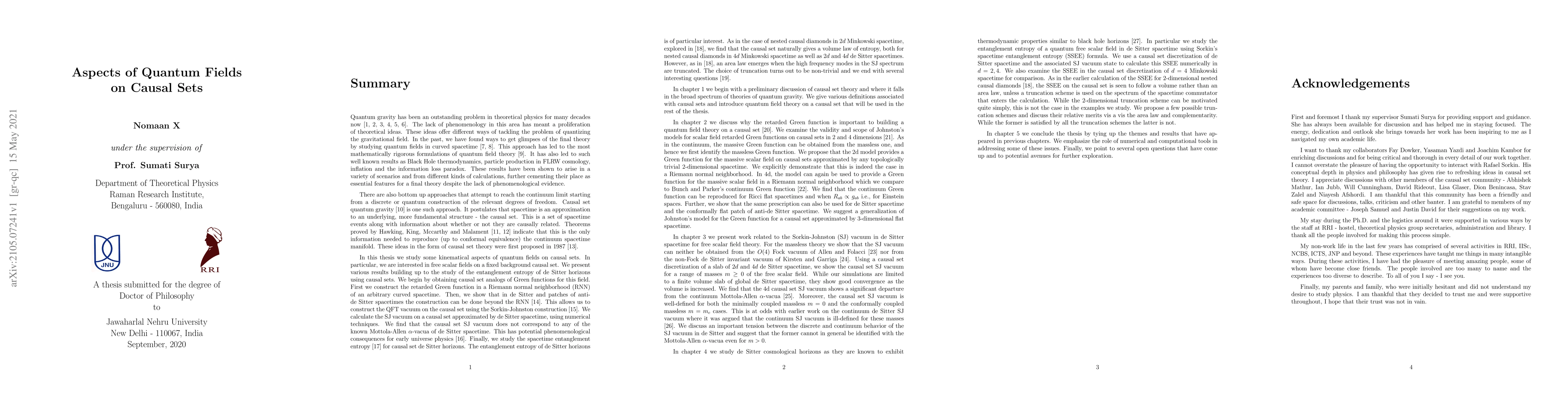This paper explores quantum fields on causal sets, focusing on free scalar fields in fixed backgrounds. It develops causal set analogs of Green functions and constructs the QFT vacuum using the Sorkin-Johnston method, finding that the resulting vacuum does not match known de Sitter vacua, with potential early universe implications. It also investigates entanglement entropy, revealing a volume law in de Sitter spacetimes but an area law when high frequency modes are truncated.