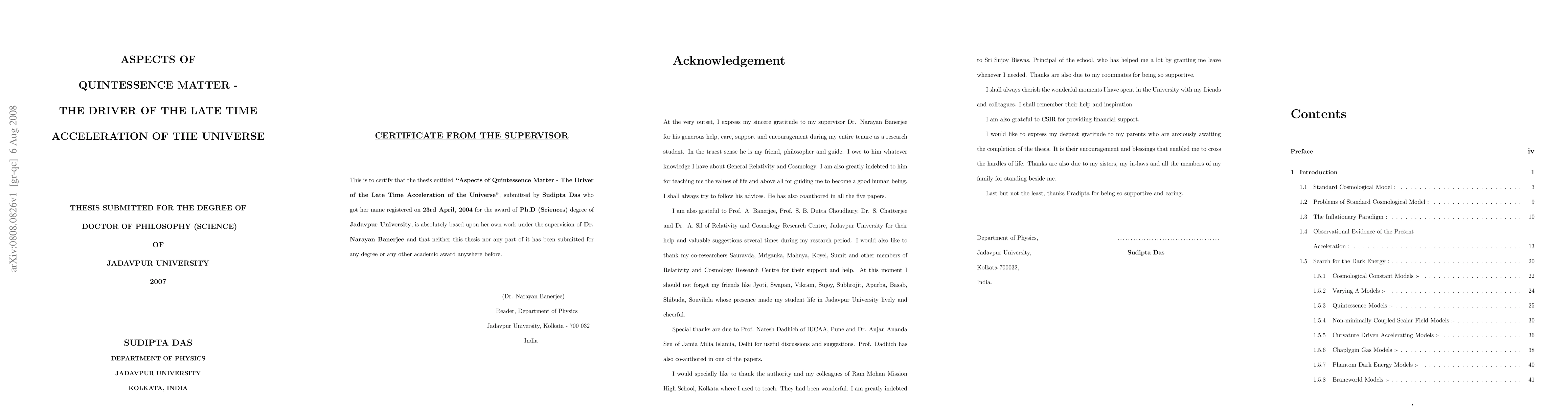 The present thesis is a collection of papers which deals with analytic models that can drive the present accelerated expansion of the universe, starting from a decelerated expansion in the early matter dominated regime. Both minimally and non minimally coupled scalar fields are employed for the purpose. Interaction between nonminimally coupled scalar field, such as the Brans-Dicke field, with dark matter and dark energy are considered. This interactions are shown to solve some fine tuning problems. Curvature driven acceleration is also considered in this thesis, which shows that a smooth transition from a deceleration to an acceleration is possible in this scenario.