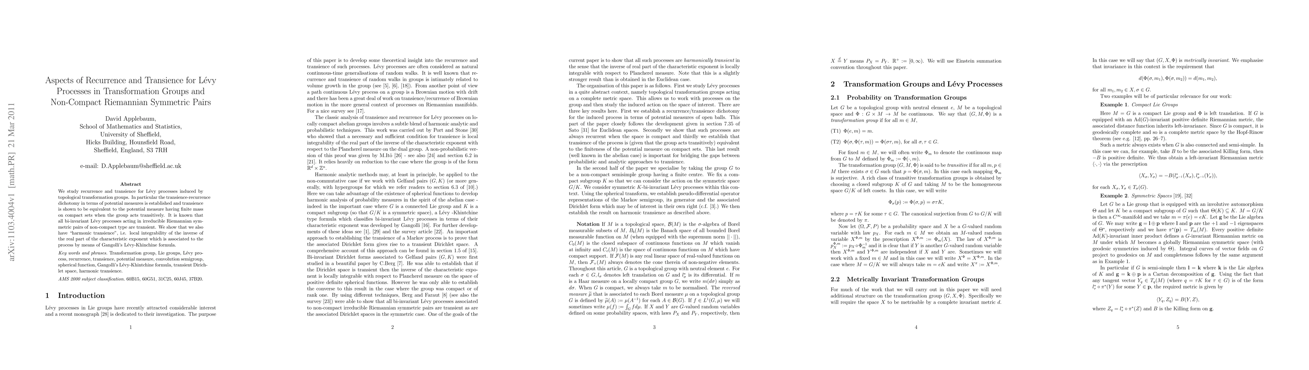 This paper investigates recurrence and transience properties of Lévy processes driven by topological transformation groups, establishing that transience corresponds to finite mass of potential measures on compact sets under transitive group actions. It also demonstrates "harmonic transience" for bi-invariant Lévy processes in irreducible Riemannian symmetric pairs of non-compact type.