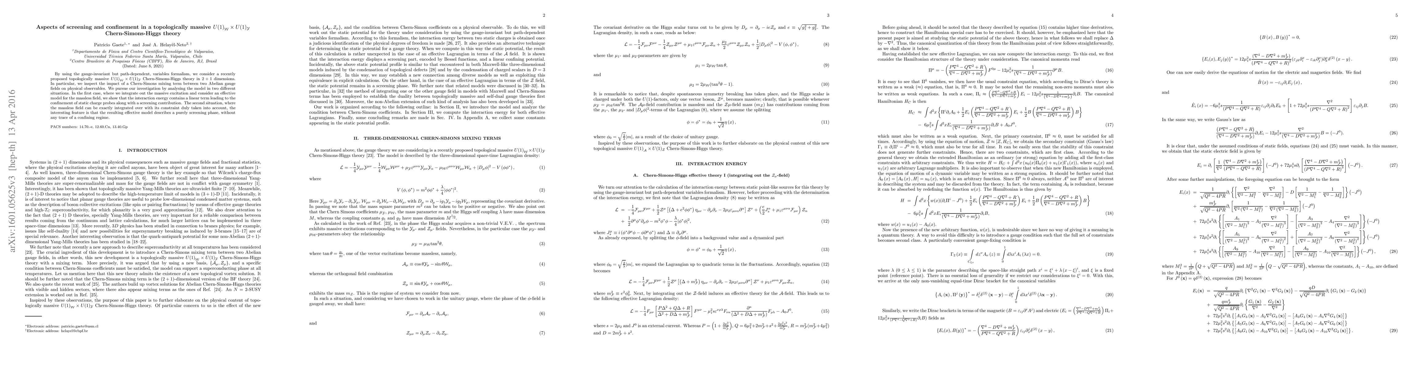 By using the gauge-invariant but path-dependent, variables formalism, we consider a recently proposed topologically massive $U{\left( 1 \right)_{\cal W}} \times U{(1)_{\cal Y}}$ Chern-Simons-Higgs theory in $2+1$ dimensions. In particular, we inspect the impact of a Chern-Simons mixing term between two Abelian gauge fields on physical observables. We pursue our investigation by analysing the model in two different situations. In the first case, where we integrate out the massive excitation and consider an effective model for the massless field, we show that the interaction energy contains a linear term leading to the confinement of static charge probes along with a screening contribution. The second situation, where the massless field can be exactly integrated over with its constraint duly taken into account, the interesting feature is that the resulting effective model describes a purely screening phase, without any trace of a confining regime.