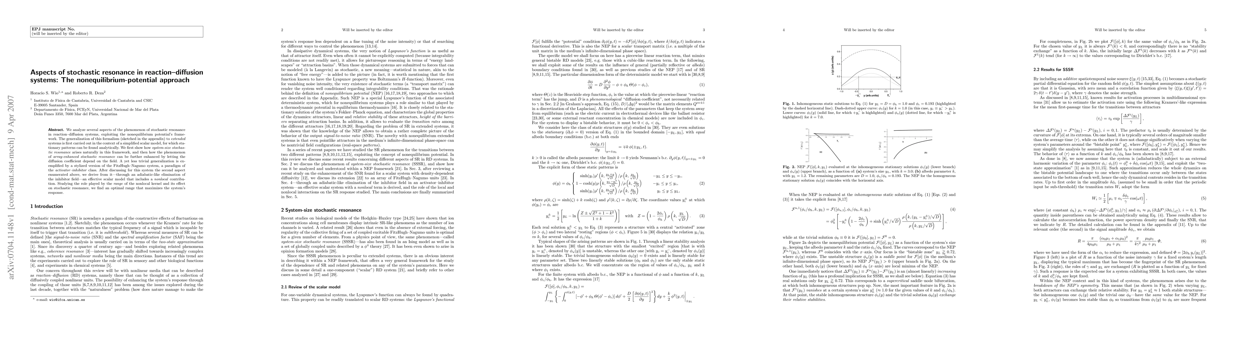 We analyze several aspects of the phenomenon of stochastic resonance in reaction-diffusion systems, exploiting the nonequilibrium potential's framework. The generalization of this formalism (sketched in the appendix) to extended systems is first carried out in the context of a simplified scalar model, for which stationary patterns can be found analytically. We first show how system-size stochastic resonance arises naturally in this framework, and then how the phenomenon of array-enhanced stochastic resonance can be further enhanced by letting the diffusion coefficient depend on the field. A yet less trivial generalization is exemplified by a stylized version of the FitzHugh-Nagumo system, a paradigm of the activator-inhibitor class. After discussing for this system the second aspect enumerated above, we derive from it -through an adiabatic-like elimination of the inhibitor field- an effective scalar model that includes a nonlocal contribution. Studying the role played by the range of the nonlocal kernel and its effect on stochastic resonance, we find an optimal range that maximizes the system's response.