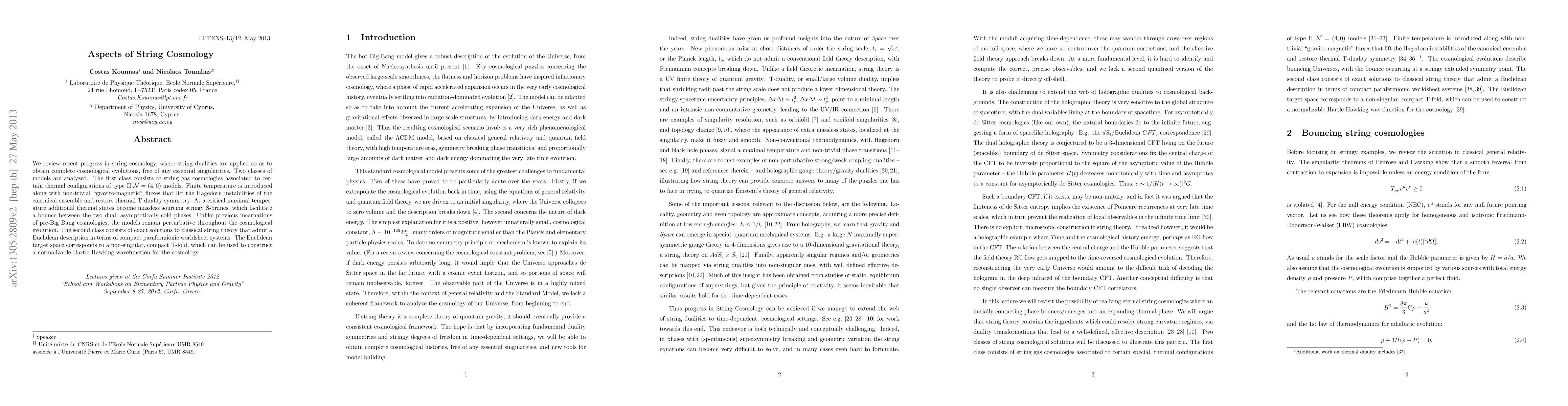 We review recent progress in string cosmology, where string dualities are applied so as to obtain complete cosmological evolutions, free of any essential singularities. Two classes of models are analyzed. The first class consists of string gas cosmologies associated to certain thermal configurations of type II N=(4,0) models. Finite temperature is introduced along with non-trivial "gravito-magnetic" fluxes that lift the Hagedorn instabilities of the canonical ensemble and restore thermal T-duality symmetry. At a critical maximal temperature additional thermal states become massless sourcing stringy S-branes, which facilitate a bounce between the two dual, asymptotically cold phases. Unlike previous incarnations of pre-Big Bang cosmologies, the models remain perturbative throughout the cosmological evolution. The second class consists of exact solutions to classical string theory that admit a Euclidean description in terms of compact parafermionic worldsheet systems. The Euclidean target space corresponds to a non-singular, compact T-fold, which can be used to construct a normalizable Hartle-Hawking wavefunction for the cosmology.