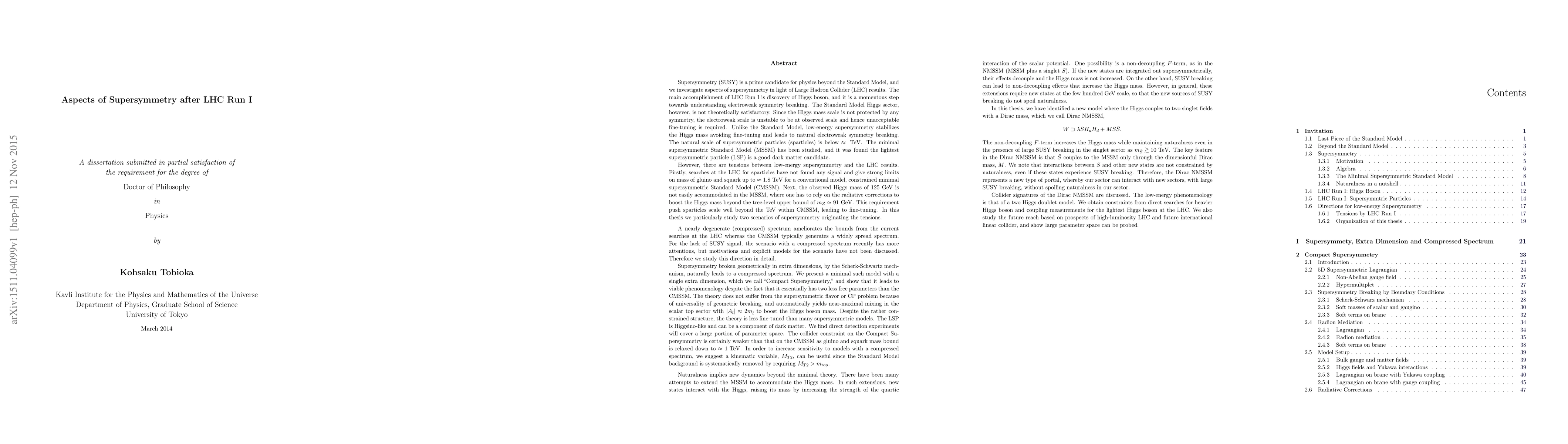 Supersymmetry is a prime candidate for physics beyond the Standard Model because low-energy supersymmetry stabilizes the Higgs mass avoiding fine-tuning and leads to natural electroweak symmetry breaking. However, searches at the Large Hadron Collider (LHC) for supersymmetric particles have not found any signal and give strong limits on mass of gluino and squark. Also, the observed Higgs mass of 125 GeV is not easily accommodated in the minimal supersymmetric Standard Model (MSSM) where one has to rely on the radiative corrections to boost the Higgs mass accompanied with fine-tuning. I study aspects of supersymmetry in light of these LHC results. In this thesis, I focus on the Compact Supersymmetry model based on arXiv:1206.4993 and the Dirac Next-to-MSSM based on arXiv:1308.0792 and investigate them in more detail.