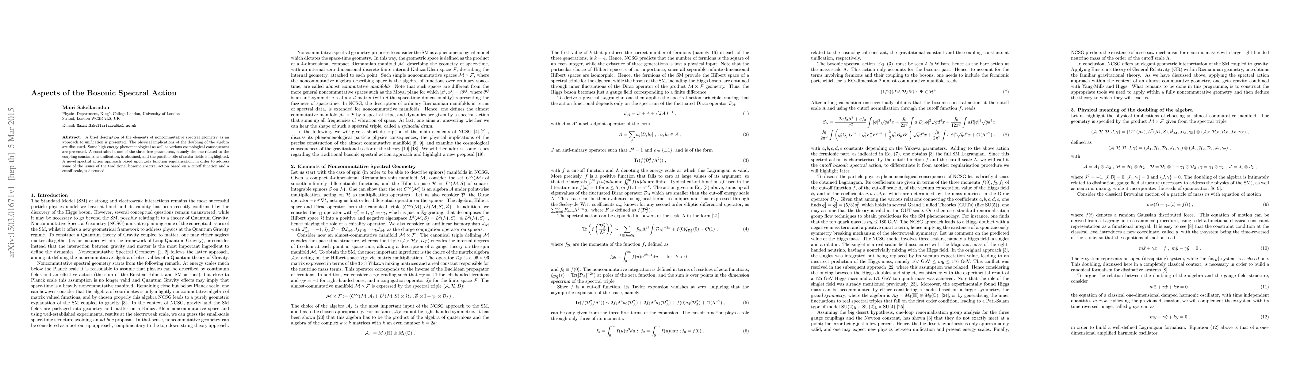 A brief description of the elements of noncommutative spectral geometry as an approach to unification is presented. The physical implications of the doubling of the algebra are discussed. Some high energy phenomenological as well as various cosmological consequences are presented. A constraint in one of the three free parameters, namely the one related to the coupling constants at unification, is obtained, and the possible role of scalar fields is highlighted. A novel spectral action approach based upon zeta function regularisation, in order to address some of the issues of the traditional bosonic spectral action based on a cutoff function and a cutoff scale, is discussed.