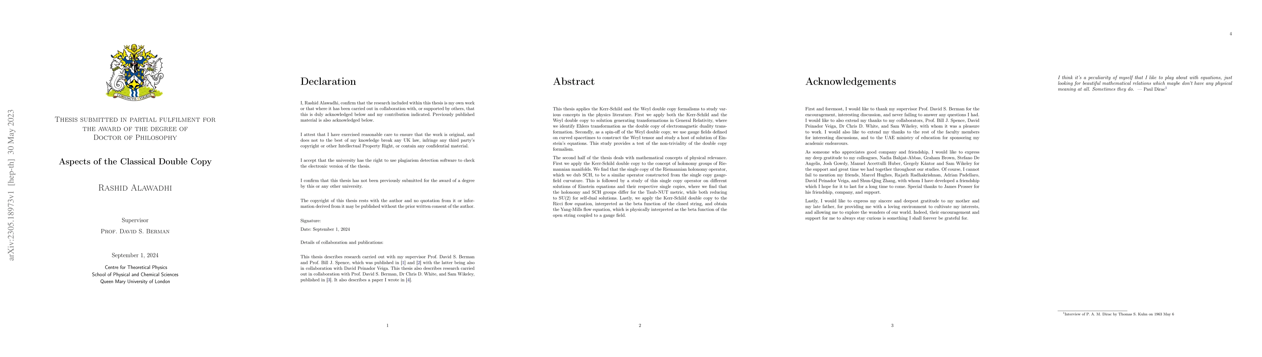 This thesis applies the Kerr-Schild and the Weyl double copy formalisms to study various concepts in the physics literature. First we apply both the Kerr-Schild and the Weyl double copy to solution generating transformations in General Relativity, where we identify Ehlers transformation as the double copy of electromagnetic duality transformation. Secondly, as a spin-off of the Weyl double copy, we use gauge fields defined on curved spacetimes to construct the Weyl tensor and study a host of solution of Einstein's equations. This study provides a test of the non-triviality of the double copy formalism. The second half of the thesis deals with mathematical concepts of physical relevance. First we apply the Kerr-Schild double copy to the concept of holonomy groups of Riemannian manifolds. We find that the single copy of the Riemannian holonomy operator, which we dub SCH, to be a similar operator constructed from the single copy gauge-field curvature. This is followed by a study of this single copy operator on different solutions of Einstein equations and their respective single copies, where we find that the holonomy and SCH groups differ for the Taub-NUT metric, while both reducing to $\text{SU}(2)$ for self-dual solutions. Lastly, we apply the Kerr-Schild double copy to the Ricci flow equation, interpreted as the beta function of the closed string, and obtain the Yang-Mills flow equation, which is physically interpreted as the beta function of the open string coupled to a gauge field.