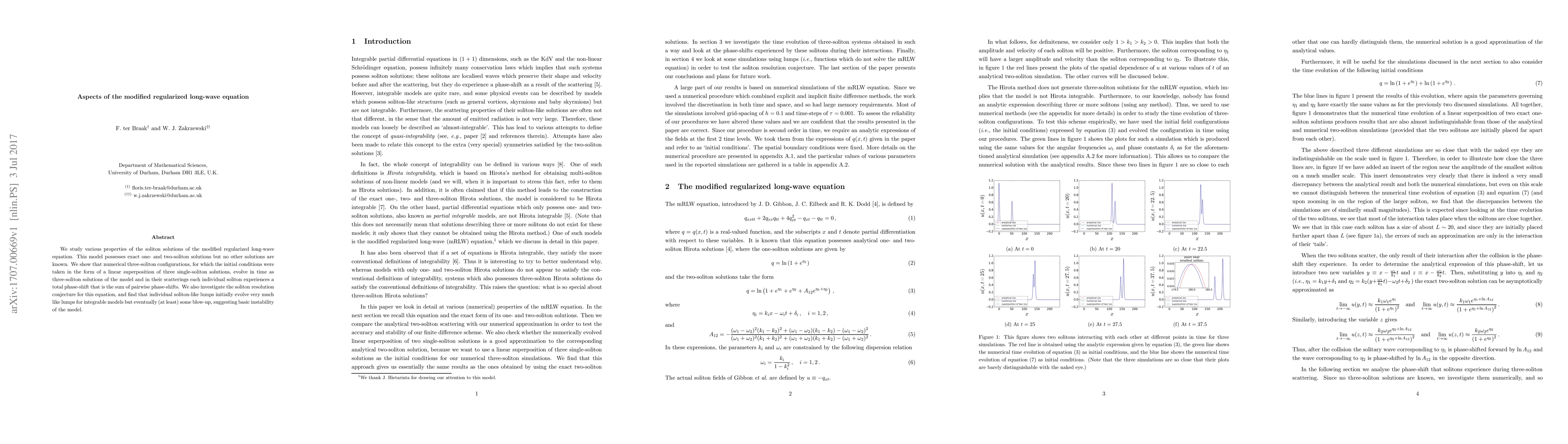 We study various properties of the soliton solutions of the modified regularized long-wave equation. This model possesses exact one- and two-soliton solutions but no other solutions are known. We show that numerical three-soliton configurations, for which the initial conditions were taken in the form of a linear superposition of three single-soliton solutions, evolve in time as three-soliton solutions of the model and in their scatterings each individual soliton experiences a total phase-shift that is the sum of pairwise phase-shifts. We also investigate the soliton resolution conjecture for this equation, and find that individual soliton-like lumps initially evolve very much like lumps for integrable models but eventually (at least) some blow-up, suggesting basic instability of the model.