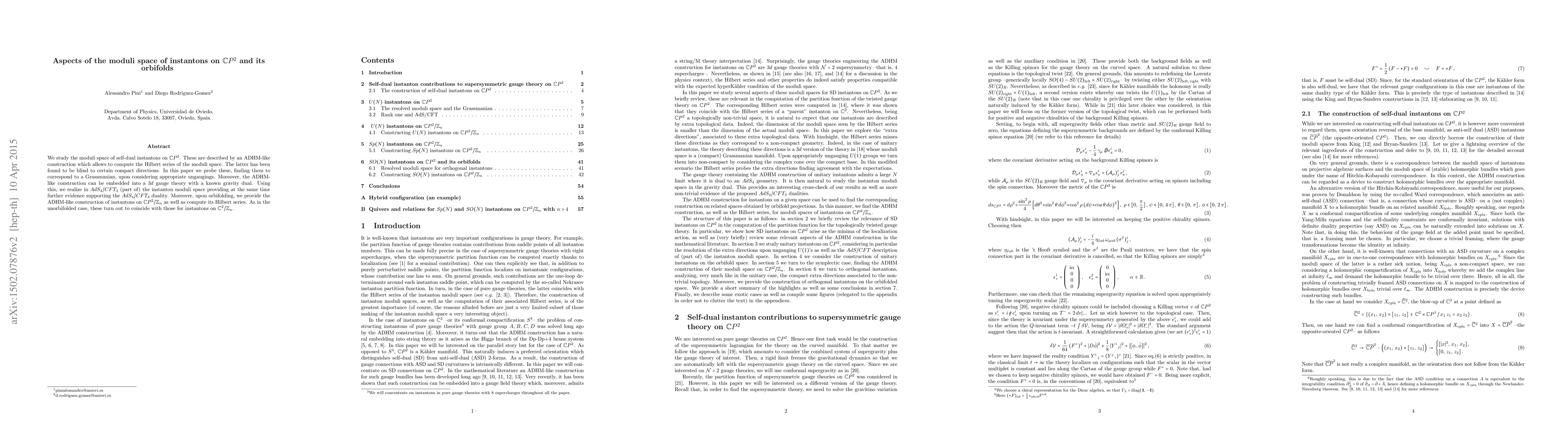 We study the moduli space of self-dual instantons on $\mathbb{C}P^2$. These are described by an ADHM-like construction which allows to compute the Hilbert series of the moduli space. The latter has been found to be blind to certain compact directions. In this paper we probe these, finding them to correspond to a Grassmanian, upon considering appropriate ungaugings. Moreover, the ADHM-like construction can be embedded into a $3d$ gauge theory with a known gravity dual. Using this, we realize in $AdS_4/CFT_3$ (part of) the instanton moduli space providing at the same time further evidence supporting the $AdS_4/CFT_3$ duality. Moreover, upon orbifolding, we provide the ADHM-like construction of instantons on $\mathbb{C}P^2/\mathbb{Z}_n$ as well as compute its Hilbert series. As in the unorbifolded case, these turn out to coincide with those for instantons on $\mathbb{C}^2/\mathbb{Z}_n$.