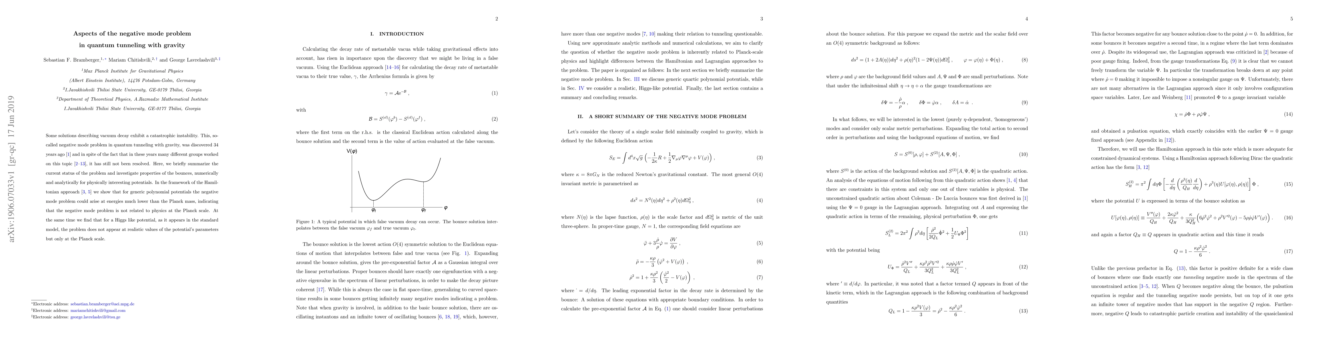 Some solutions describing vacuum decay exhibit a catastrophic instability. This, so-called negative mode problem in quantum tunneling with gravity, was discovered 34 years ago and in spite of the fact that in these years many different groups worked on this topic, it has still not been resolved. Here, we briefly summarize the current status of the problem and investigate properties of the bounces, numerically and analytically for physically interesting potentials. In the framework of the Hamiltonian approach we show that for generic polynomial potentials the negative mode problem could arise at energies much lower than the Planck mass, indicating that the negative mode problem is not related to physics at the Planck scale. At the same time we find that for a Higgs like potential, as it appears in the standard model, the problem does not appear at realistic values of the potential's parameters but only at the Planck scale.