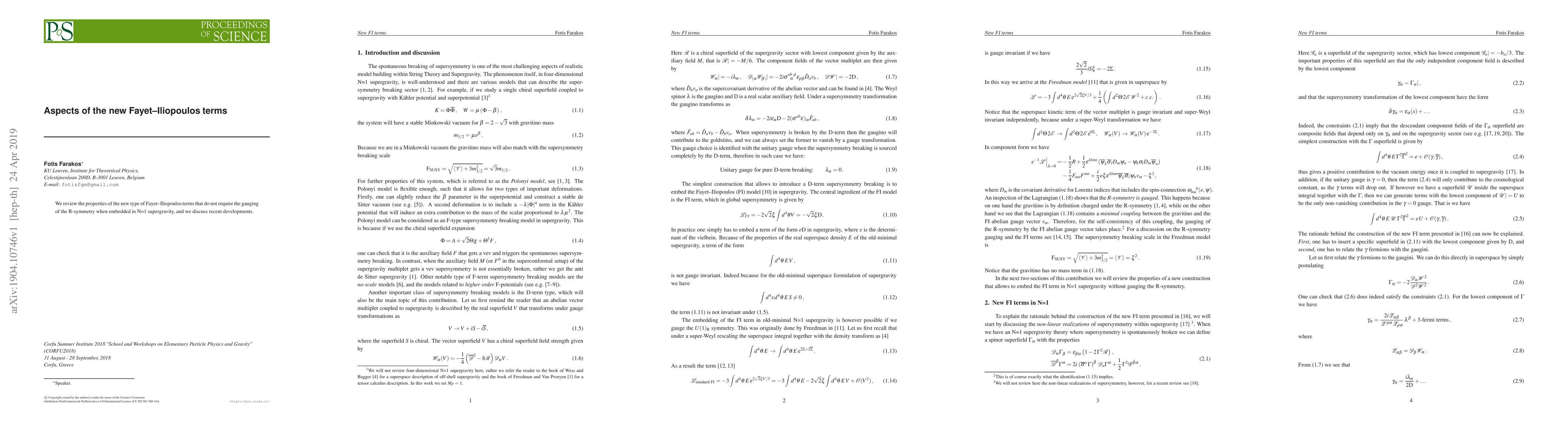 We review the properties of the new type of Fayet-Iliopoulos terms that do not require the gauging of the R-symmetry when embedded in N=1 supergravity, and we discuss recent developments.