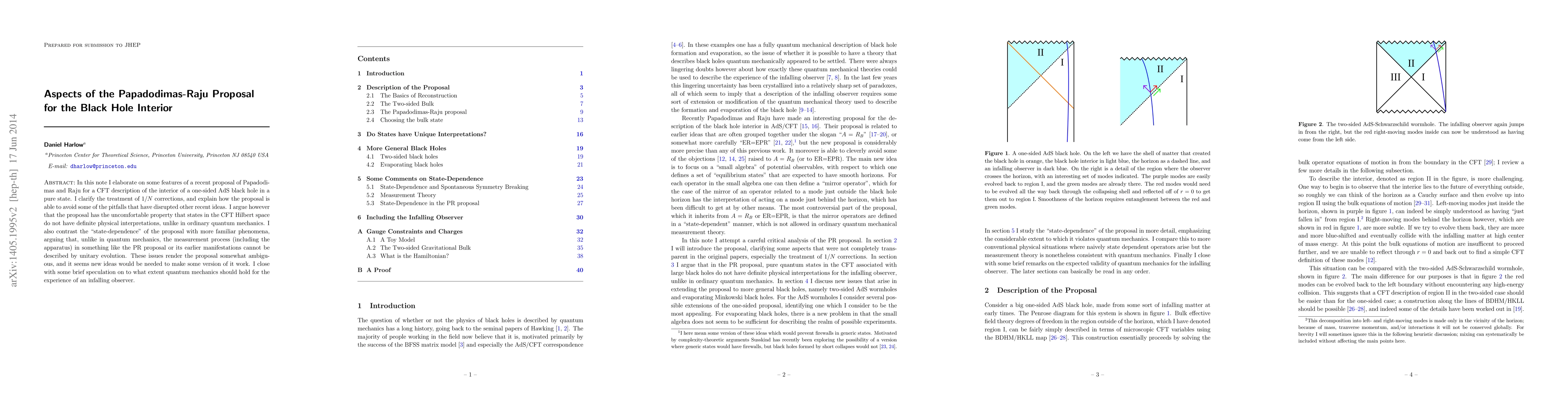 The paper clarifies aspects of the Papadodimas-Raju proposal, particularly focusing on 1/N corrections and state-dependence in CFT descriptions of black hole interiors.