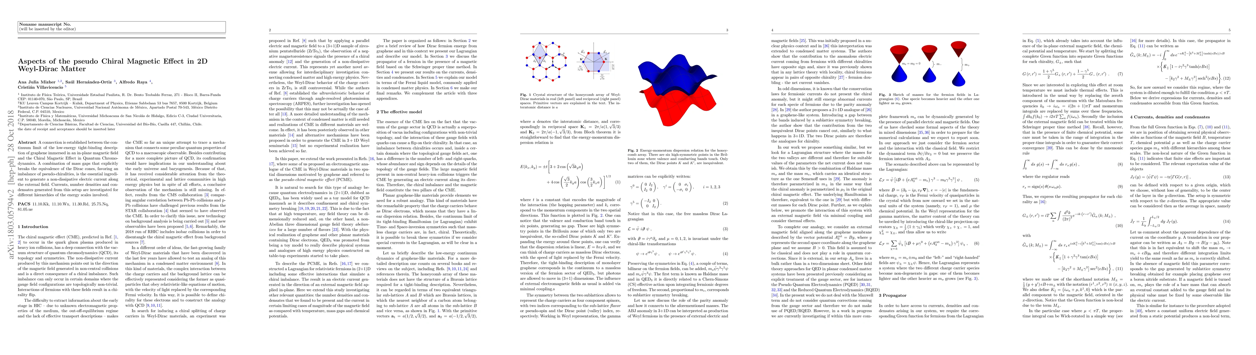 A connection is established between the continuum limit of the low-energy tight-binding description of graphene immersed in an in-plane magnetic field and the Chiral Magnetic Effect in Quantum Chromodynamics. A combination of mass gaps that explicitly breaks the equivalence of the Dirac cones, favoring an imbalance of pseudo-chiralities, is the essential ingredient to generate a non-dissipative electric current along the external field. Currents, number densities and condensates generated from this setup are investigated for different hierarchies of the energy scales involved.