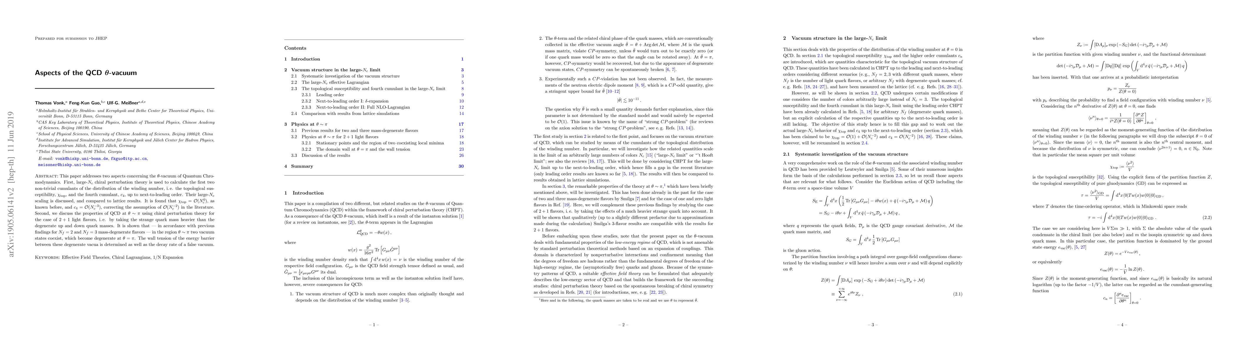 This paper addresses two aspects concerning the $\theta$-vacuum of Quantum Chromodynamics. First, large-$N_c$ chiral perturbation theory is used to calculate the first two non-trivial cumulants of the distribution of the winding number, i.\,e. the topological susceptibility, $\chi_\mathrm{top}$, and the fourth cumulant, $c_4$, up to next-to-leading order. Their large-$N_c$ scaling is discussed, and compared to lattice results. It is found that $\chi_\mathrm{top}=\mathcal{O}(N_c^0)$, as known before, and $c_4=\mathcal{O}(N_c^{-3})$, correcting the assumption of $\mathcal{O}(N_c^{-2})$ in the literature. Second, we discuss the properties of QCD at $\theta\sim\pi$ using chiral perturbation theory for the case of $2+1$ light flavors, i.\,e. by taking the strange quark mass heavier than the degenerate up and down quark masses. It is shown that --- in accordance with previous findings for $N_f=2$ and $N_f=3$ mass-degenerate flavors --- in the region $\theta\sim\pi$ two vacuum states coexist, which become degenerate at $\theta=\pi$. The wall tension of the energy barrier between these degenerate vacua is determined as well as the decay rate of a false vacuum.