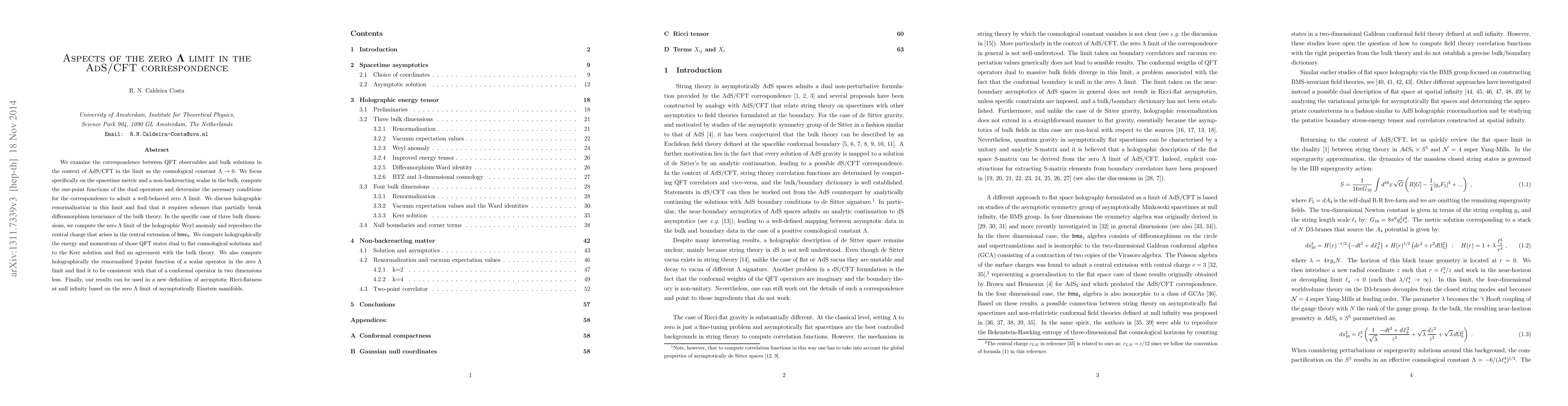 We examine the correspondence between QFT observables and bulk solutions in the context of AdS/CFT in the limit as the cosmological constant $\Lambda \to 0$. We focus specifically on the spacetime metric and a non-backreacting scalar in the bulk, compute the one-point functions of the dual operators and determine the necessary conditions for the correspondence to admit a well-behaved zero $\Lambda$ limit. We discuss holographic renormalization in this limit and find that it requires schemes that partially break diffeomorphism invariance of the bulk theory. In the specific case of three bulk dimensions, we compute the zero $\Lambda$ limit of the holographic Weyl anomaly and reproduce the central charge that arises in the central extension of $\mathfrak{bms}_{3}$. We compute holographically the energy and momentum of those QFT states dual to flat cosmological solutions and to the Kerr solution and find an agreement with the bulk theory. We also compute holographically the renormalized 2-point function of a scalar operator in the zero $\Lambda$ limit and find it to be consistent with that of a conformal operator in two dimensions less. Finally, our results can be used in a new definition of asymptotic Ricci-flatness at null infinity based on the zero $\Lambda$ limit of asymptotically Einstein manifolds.