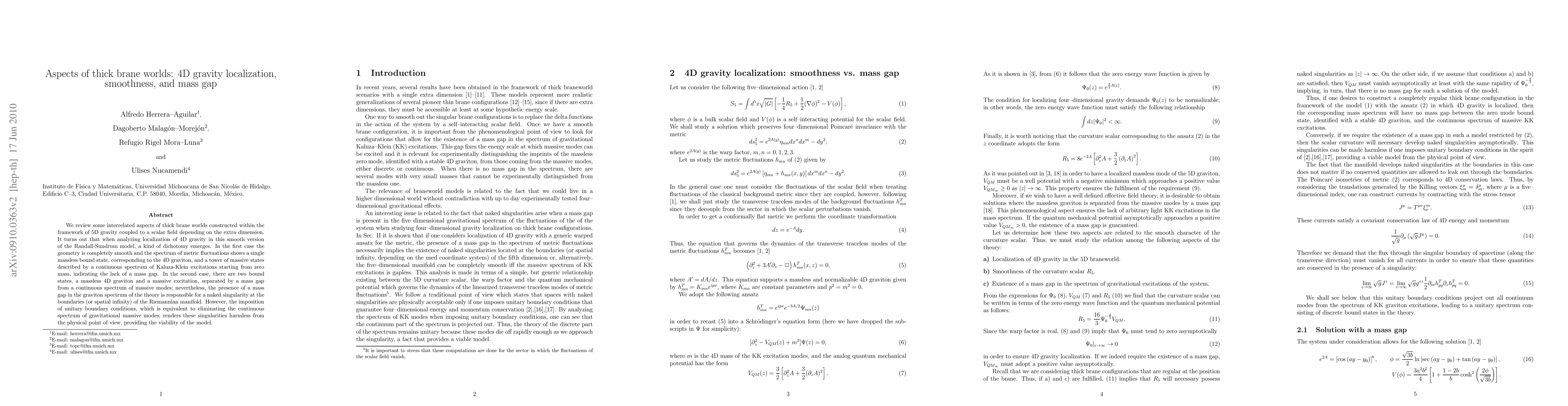 We review some interrelated aspects of thick brane worlds constructed within the framework of 5D gravity coupled to a scalar field depending on the extra dimension. It turns out that when analyzing localization of 4D gravity in this smooth version of the Randall-Sundrum model, a kind of dichotomy emerges. In the first case the geometry is completely smooth and the spectrum of metric fluctuations shows a single massless bound state, corresponding to the 4D graviton, and a tower of massive states described by a continuous spectrum of Kaluza-Klein excitations starting from zero mass, indicating the lack of a mass gap. In the second case, there are two bound states, a massless 4D graviton and a massive excitation, separated by a mass gap from a continuous spectrum of massive modes; nevertheless, the presence of a mass gap in the graviton spectrum of the theory is responsible for a naked singularity at the boundaries (or spatial infinity) of the Riemannian manifold. However, the imposition of unitary boundary conditions, which is equivalent to eliminating the continuous spectrum of gravitational massive modes, renders these singularities harmless from the physical point of view, providing the viability of the model.