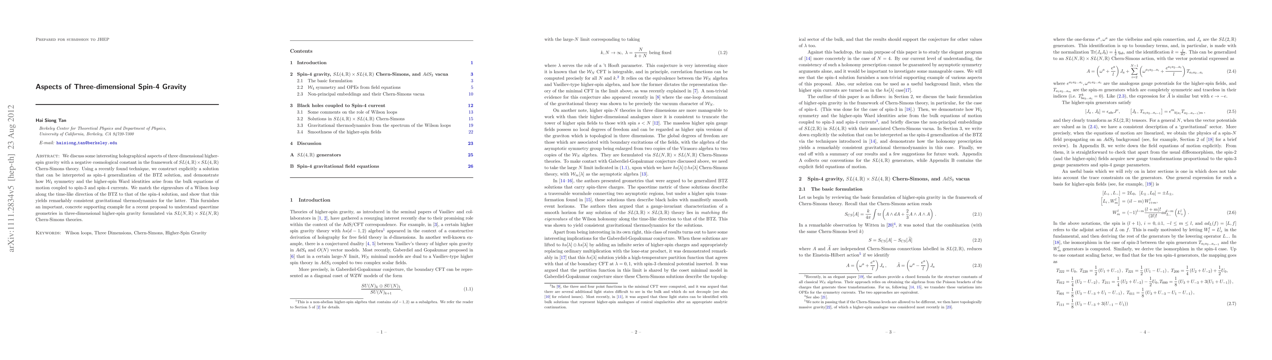 We discuss some interesting holographical aspects of three-dimensional higher-spin gravity with a negative cosmological constant in the framework of SL(4, R) \times SL(4, R) Chern-Simons theory. Using a recently found technique, we construct explicitly a solution that can be interpreted as spin-4 generalization of the BTZ solution, and demonstrate how W_4 symmetry and the higher-spin Ward identities arise from the bulk equations of motion coupled to spin-3 and spin-4 currents. We match the eigenvalues of a Wilson loop along the time-like direction of the BTZ to that of the spin-4 solution, and show that this yields remarkably consistent gravitational thermodynamics for the latter. This furnishes an important, concrete supporting example for a recent proposal to understand spacetime geometries in three-dimensional higher-spin gravity formulated via SL(N, R) \times SL(N, R) Chern-Simons theories.