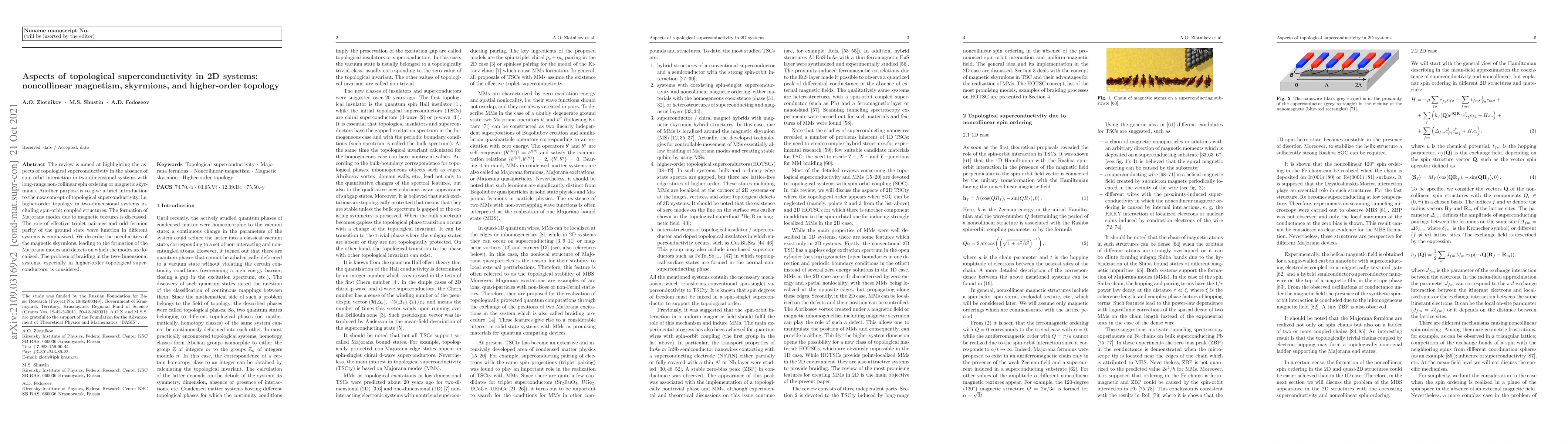 This paper reviews topological superconductivity in 2D systems without spin-orbit interaction, focusing on noncollinear magnetism and skyrmions. It introduces higher-order topological superconductivity, discusses Majorana modes formation due to magnetic textures, and explores braiding issues in these systems.