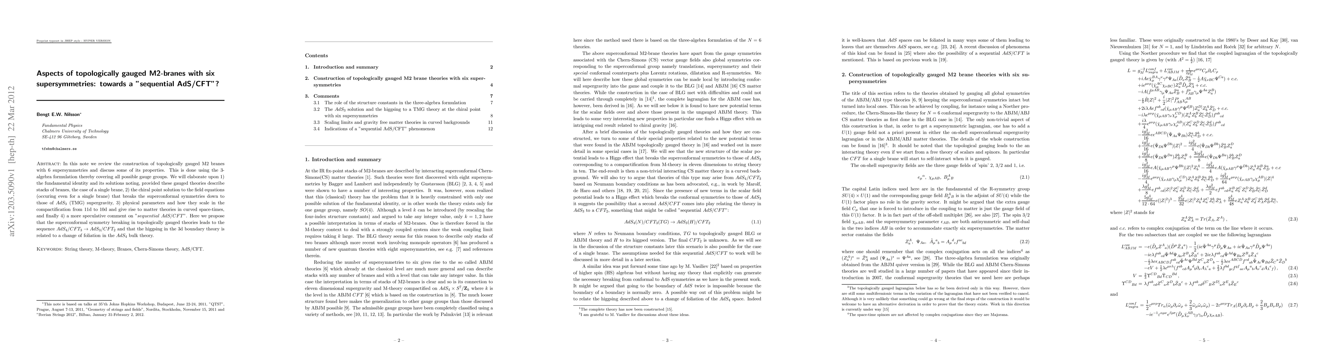 In this note we review the construction of topologically gauged M2 branes with 6 supersymmetries and discuss some of its properties. This is done using the 3-algebra formulation thereby covering all possible gauge groups. We will elaborate upon 1) the fundamental identity and its solutions noting, provided these gauged theories describe stacks of branes, the case of a single brane, 2) the chiral point solution to the field equations (occuring even for a single brane) that breaks the superconformal symmetries down to those of AdS_3 (TMG) supergravity, 3) physical parameters and how they scale in the compactification from 11d to 10d and give rise to matter theories in curved space-times, and finally 4) a more speculative comment on "sequential AdS/CFT". Here we propose that the superconformal symmetry breaking in topologically gauged theories leads to the sequence AdS_4/CFT_3 -> AdS_3/CFT_2 and that the higgsing in the 3d boundary theory is related to a change of foliation in the AdS_4 bulk theory.