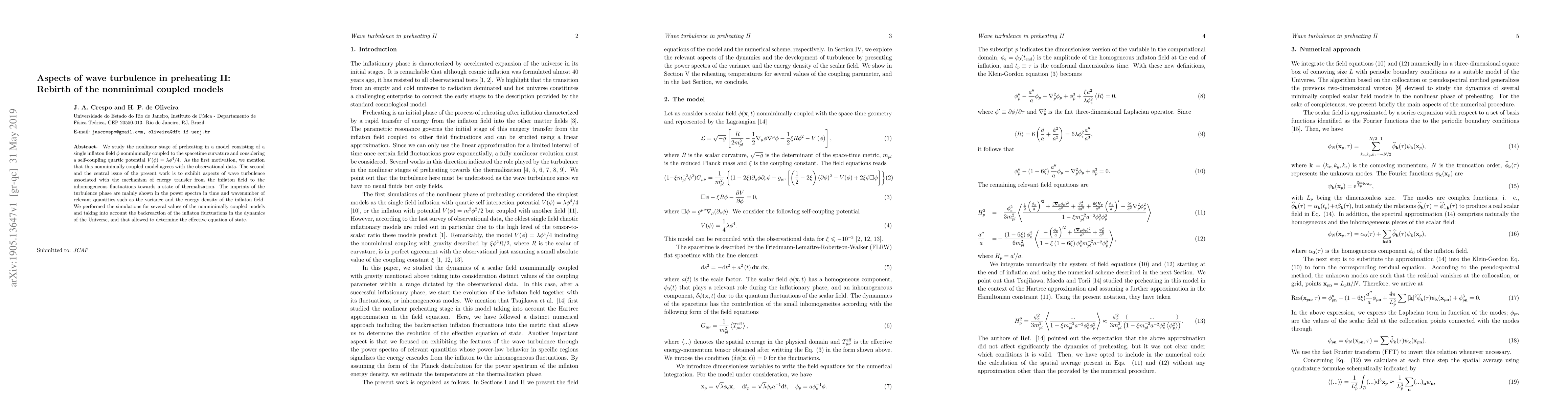 We study the nonlinear stage of preheating in a model consisting of a single inflaton field $\phi$ nonminimally coupled to the spacetime curvature and considering a self-coupling quartic potential V ($\phi$) = $\lambda \phi^4/4$. As the first motivation, we mention that this nonminimally coupled model agrees with the observational data. The second and the central issue of the present work is to exhibit aspects of wave turbulence associated with the mechanism of energy transfer from the inflaton field to the inhomogeneous fluctuations towards a state of thermalization. The imprints of the turbulence phase are mainly shown in the power spectra in time and wavenumber of relevant quantities such as the variance and the energy density of the inflaton field. We performed the simulations for several values of the nonminimally coupled models and taking into account the backreaction of the inflaton fluctuations in the dynamics of the Universe, and that allowed to determine the effective equation of state.