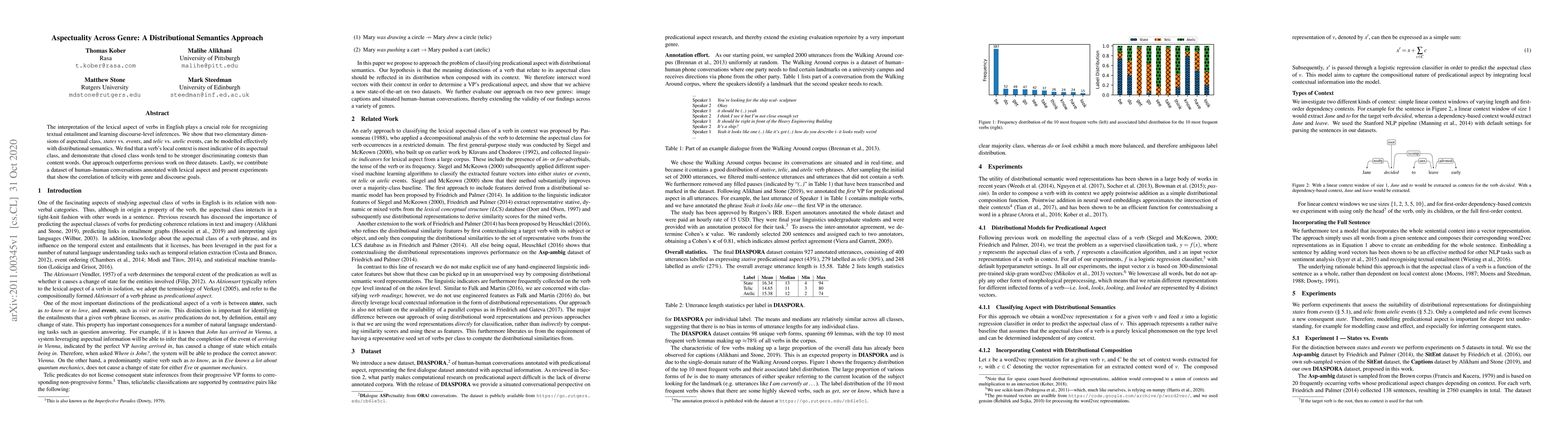 This study uses distributional semantics to analyze verb aspect in English, finding that local context is key to understanding aspectual class and that certain words are more effective at distinguishing between different aspects of meaning.