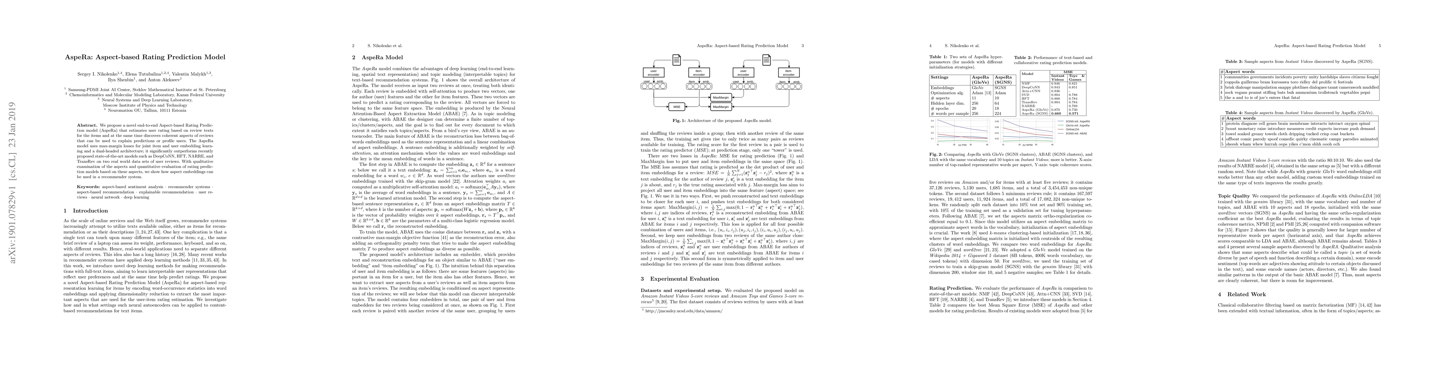 The AspeRa model is a novel end-to-end approach for predicting user ratings from review texts while identifying coherent aspects, outperforming state-of-the-art models on real-world datasets. It uses max-margin losses and a dual-headed architecture to enhance performance and aspect embeddings for recommender systems.