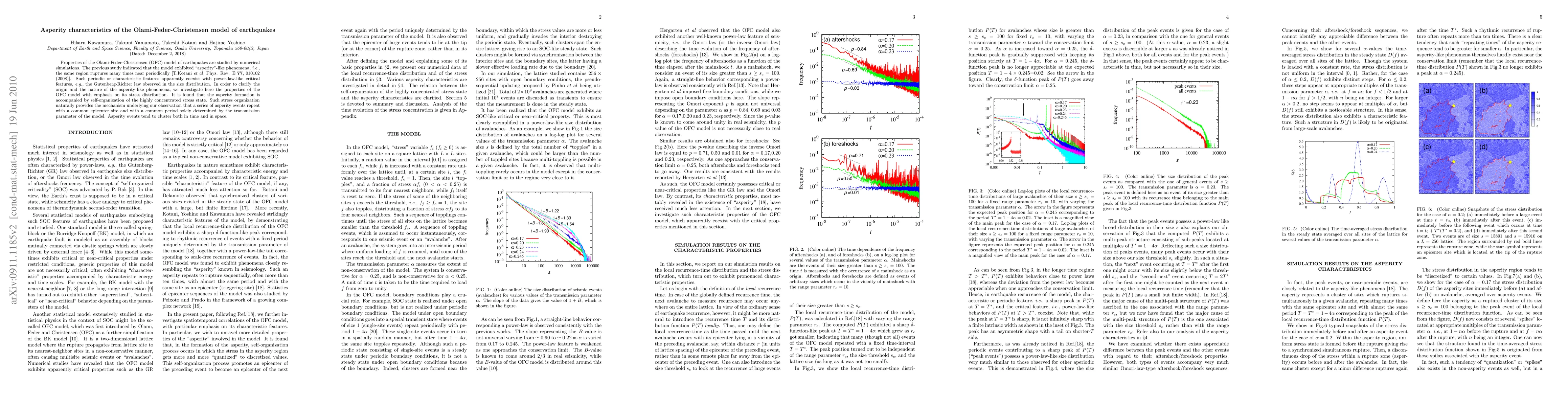 This study investigates the Olami-Feder-Christensen model of earthquakes, revealing that asperity-like phenomena arise from self-organized stress concentration. The model's periodic asperity events are driven by a common epicenter and period, determined by the model's transmission parameter.