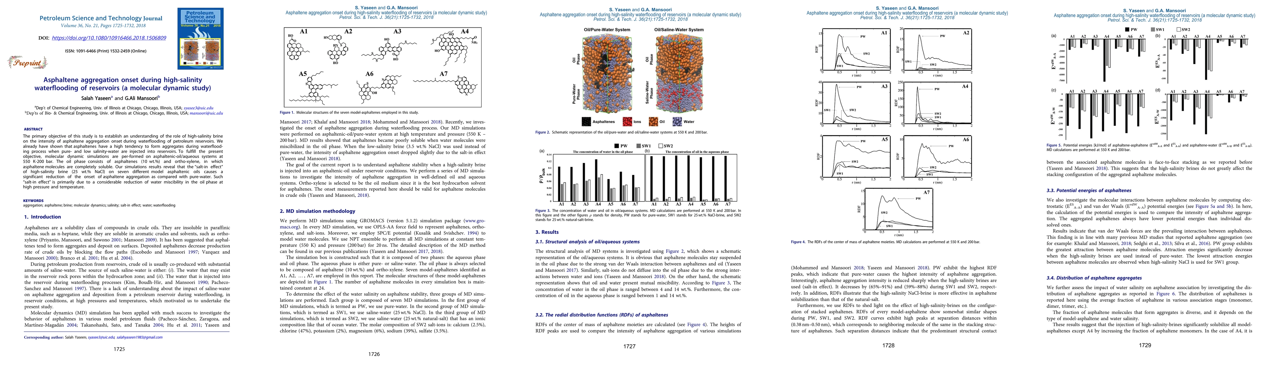 This study uses molecular dynamics simulations to demonstrate that high-salinity brine significantly reduces the onset of asphaltene aggregation in petroleum reservoirs during waterflooding, due to decreased water miscibility in the oil phase under high pressure and temperature conditions.