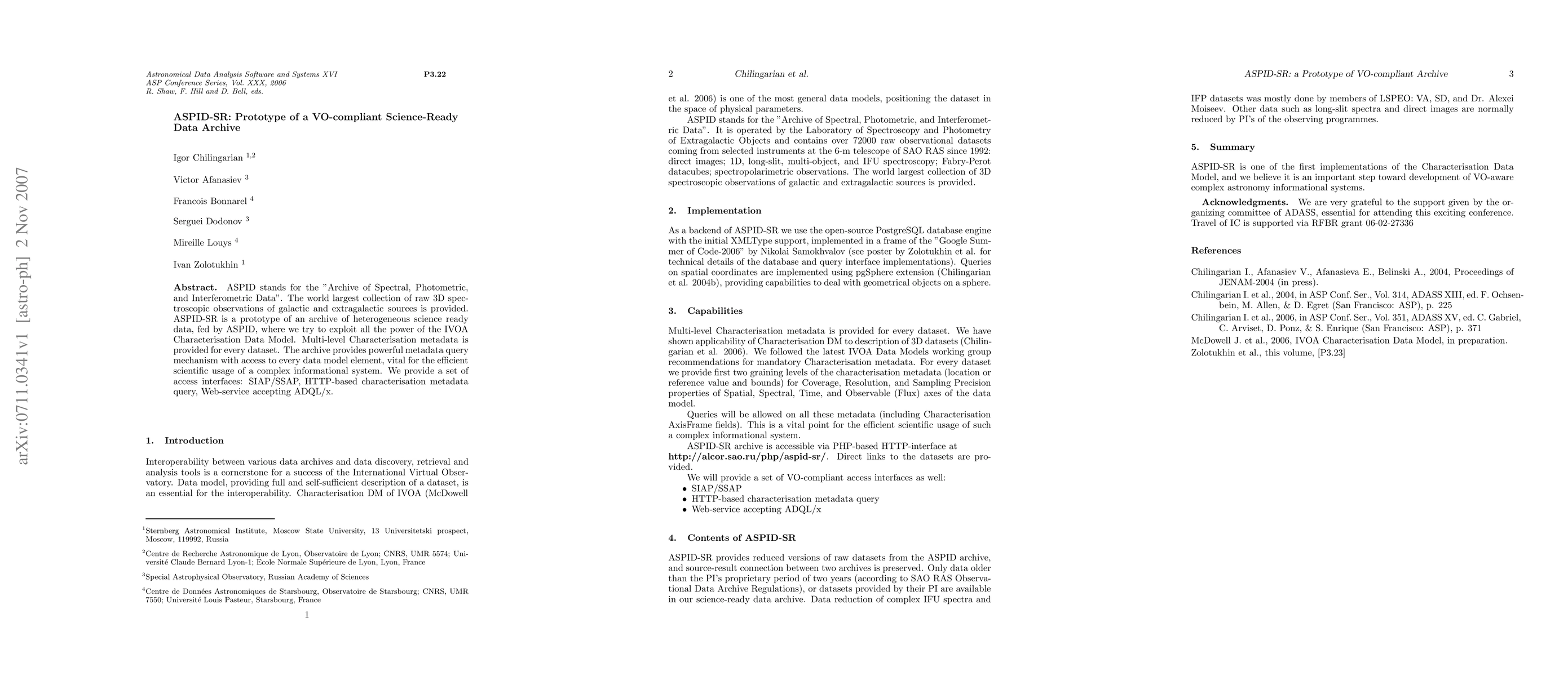 ASPID stands for the "Archive of Spectral, Photometric, and Interferometric Data". The world largest collection of raw 3D spectroscopic observations of galactic and extragalactic sources is provided. ASPID-SR is a prototype of an archive of heterogeneous science ready data, fed by ASPID, where we try to exploit all the power of the IVOA Characterisation Data Model. Multi-level Characterisation metadata is provided for every dataset. The archive provides powerful metadata query mechanism with access to every data model element, vital for the efficient scientific usage of a complex informational system. We provide a set of access interfaces: SIAP/SSAP, HTTP-based characterisation metadata query, Web-service accepting ADQL/x.