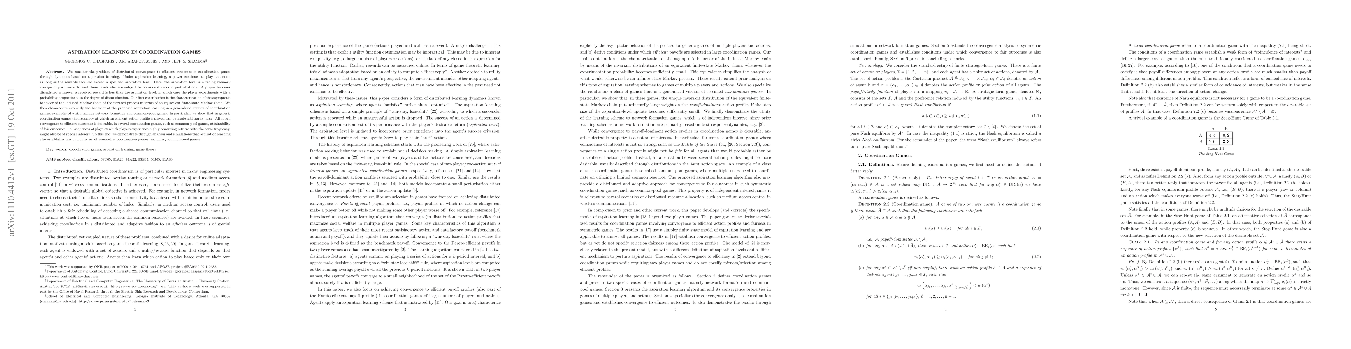 This paper explores distributed convergence to efficient outcomes in coordination games using aspiration learning dynamics. It characterizes the asymptotic behavior of the induced Markov chain and demonstrates that aspiration learning can achieve frequent efficient action profiles and fair outcomes in symmetric coordination games, including common-pool games.