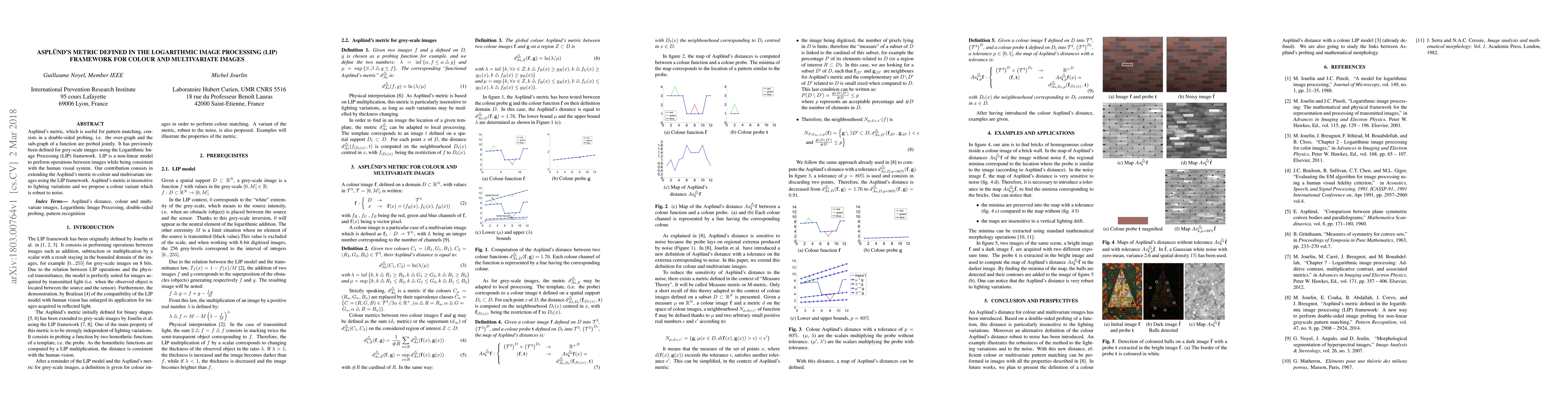 Aspl{\"u}nd's metric, which is useful for pattern matching, consists in a double-sided probing, i.e. the over-graph and the sub-graph of a function are probed jointly. It has previously been defined for grey-scale images using the Logarithmic Image Processing (LIP) framework. LIP is a non-linear model to perform operations between images while being consistent with the human visual system. Our contribution consists in extending the Aspl{\"u}nd's metric to colour and multivariate images using the LIP framework. Aspl{\"u}nd's metric is insensitive to lighting variations and we propose a colour variant which is robust to noise.