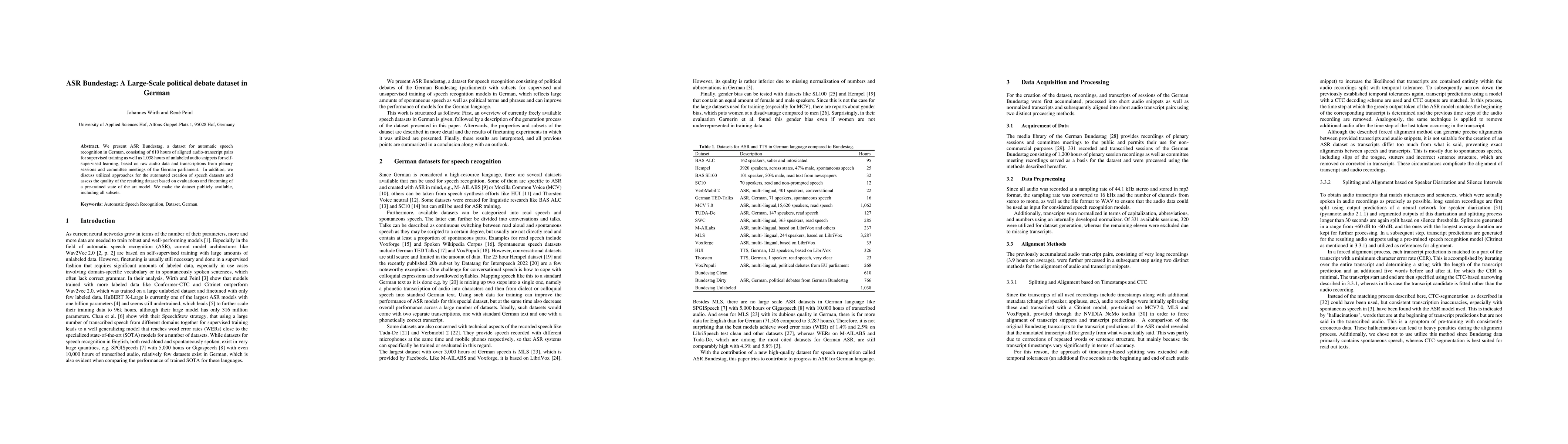 This paper introduces ASR Bundestag, a large German political debate dataset comprising 610 hours of aligned audio-transcript pairs and 1,038 hours of unlabeled audio for training, aimed at advancing automatic speech recognition. The dataset is publicly available and includes methods for its creation and evaluation.