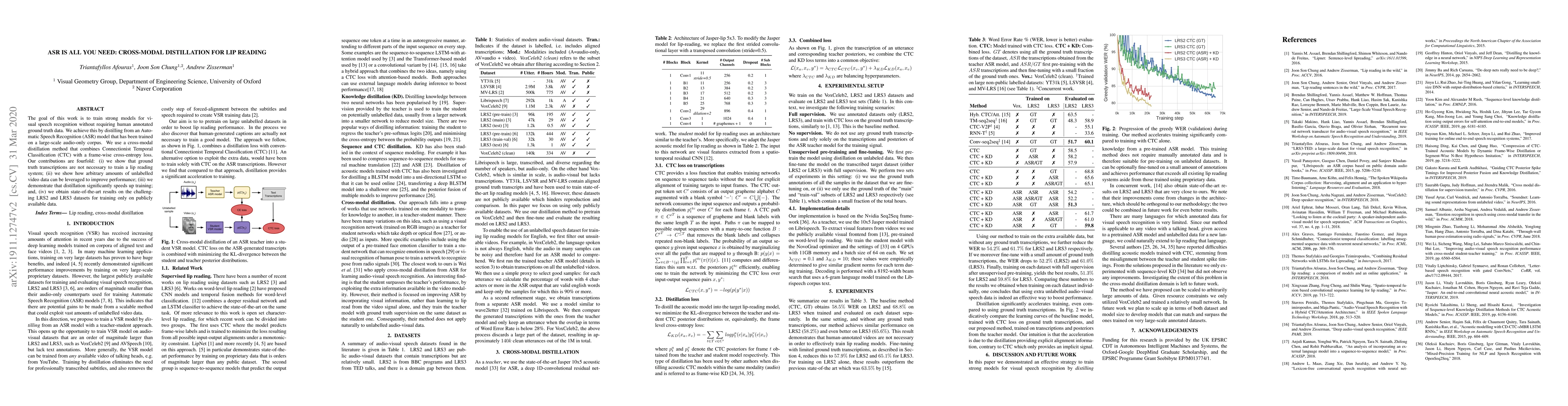 The goal of this work is to train strong models for visual speech recognition without requiring human annotated ground truth data. We achieve this by distilling from an Automatic Speech Recognition (ASR) model that has been trained on a large-scale audio-only corpus. We use a cross-modal distillation method that combines Connectionist Temporal Classification (CTC) with a frame-wise cross-entropy loss. Our contributions are fourfold: (i) we show that ground truth transcriptions are not necessary to train a lip reading system; (ii) we show how arbitrary amounts of unlabelled video data can be leveraged to improve performance; (iii) we demonstrate that distillation significantly speeds up training; and, (iv) we obtain state-of-the-art results on the challenging LRS2 and LRS3 datasets for training only on publicly available data.
