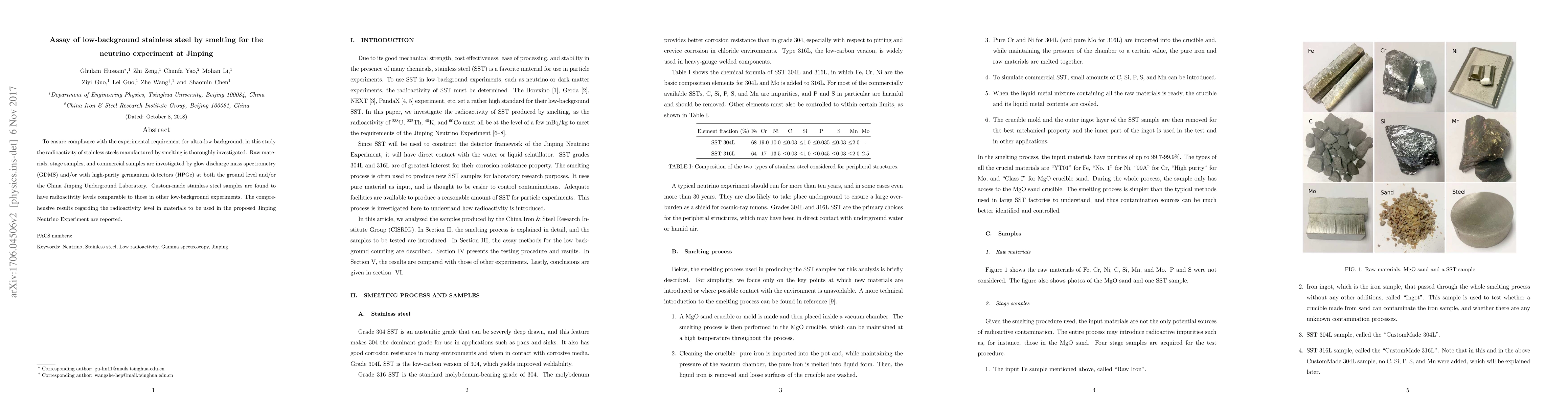 The paper presents a comprehensive assay of low-background stainless steel by smelting, providing valuable data for future neutrino experiments requiring ultra-low radioactive background.