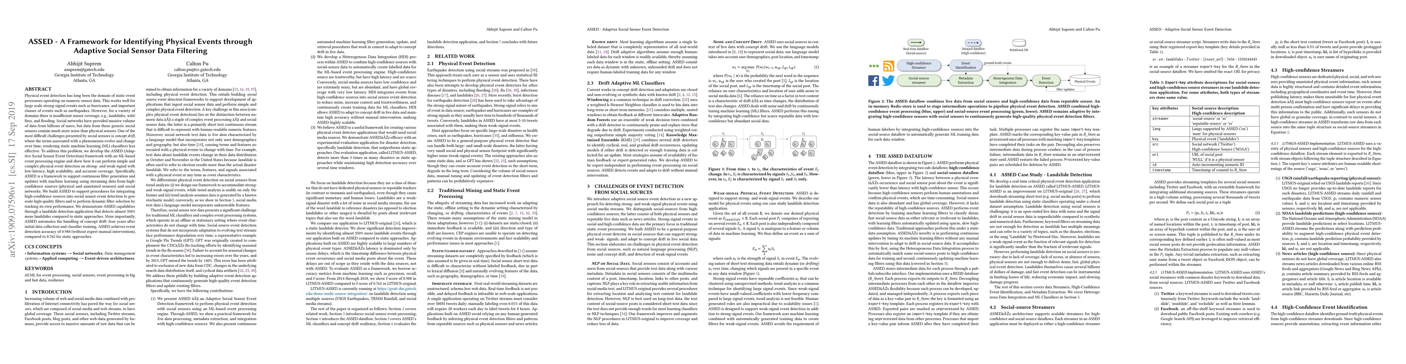 Physical event detection has long been the domain of static event processors operating on numeric sensor data. This works well for large scale strong-signal events such as hurricanes, and important classes of events such as earthquakes. However, for a variety of domains there is insufficient sensor coverage, e.g., landslides, wildfires, and flooding. Social networks have provided massive volume of data from billions of users, but data from these generic social sensors contain much more noise than physical sensors. One of the most difficult challenges presented by social sensors is \textit{concept drift}, where the terms associated with a phenomenon evolve and change over time, rendering static machine learning (ML) classifiers less effective. To address this problem, we develop the ASSED (Adaptive Social Sensor Event Detection) framework with an ML-based event processing engine and show how it can perform simple and complex physical event detection on strong- \textit{and} weak-signal with low-latency, high scalability, and accurate coverage. Specifically, ASSED is a framework to support continuous filter generation and updates with machine learning using streaming data from high-confidence sources (physical and annotated sensors) and social networks. We build ASSED to support procedures for integrating high-confidence sources into social sensor event detection to generate high-quality filters and to perform dynamic filter selection by tracking its own performance. We demonstrate ASSED capabilities through a landslide detection application that detects almost 350\% more landslides compared to static approaches. More importantly, ASSED automates the handling of concept drift: four years after initial data collection and classifier training, ASSED achieves event detection accuracy of 0.988 (without expert manual intervention), compared to 0.762 for static approaches.