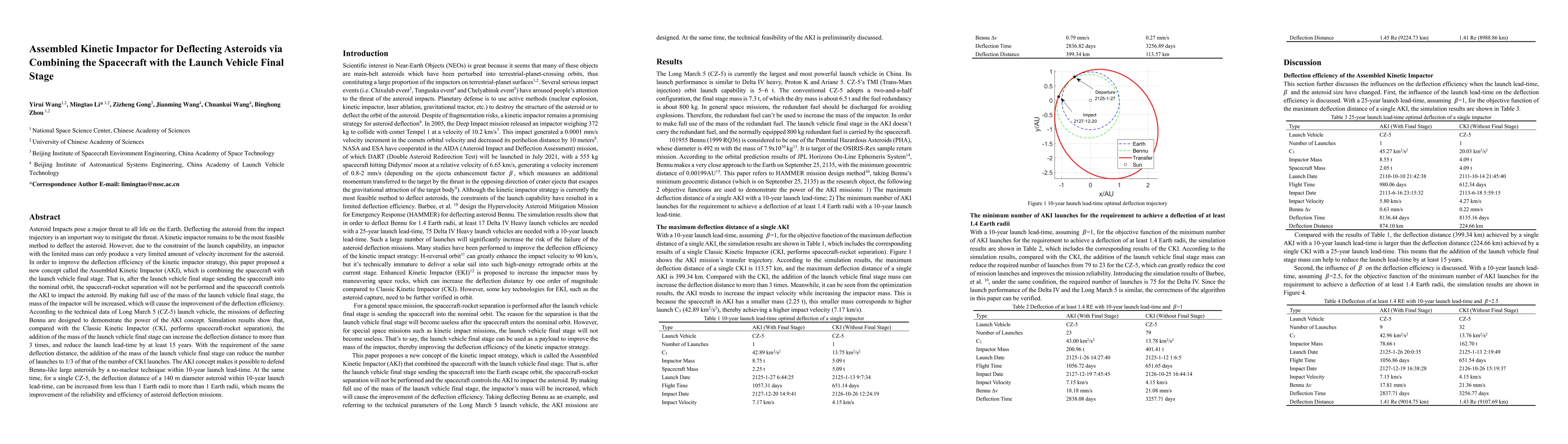 A new concept called Assembled Kinetic Impactor (AKI) combines a spacecraft with a launch vehicle final stage to improve asteroid deflection efficiency, increasing deflection distance up to 3 times and reducing launch lead-time by at least 15 years.