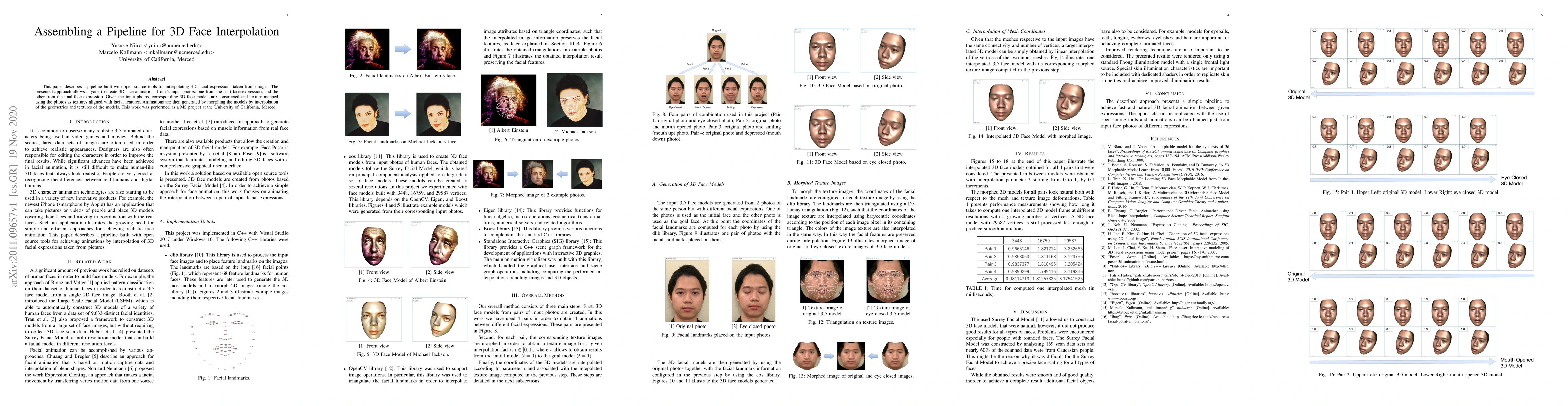 This paper describes a pipeline built with open source tools for interpolating 3D facial expressions taken from images. The presented approach allows anyone to create 3D face animations from 2 input photos: one from the start face expression, and the other from the final face expression. Given the input photos, corresponding 3D face models are constructed and texture-mapped using the photos as textures aligned with facial features. Animations are then generated by morphing the models by interpolation of the geometries and textures of the models. This work was performed as a MS project at the University of California, Merced.